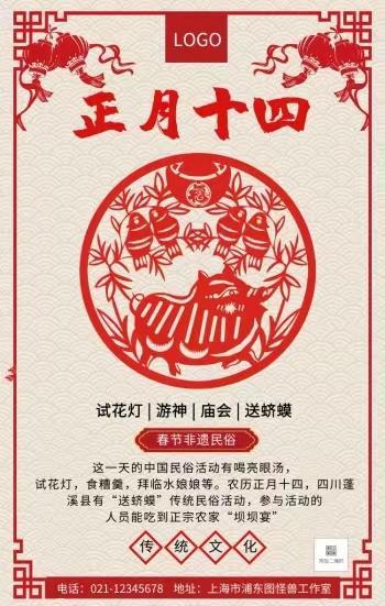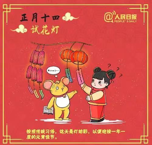 正月十四也是元宵節慶祝活動的準備試燈日。有“試花燈”的習俗。在這一天,人們開始選購燈籠,搭蓋燈棚,爲即將到來的元宵節做好準備。童謠中唱道:“十一嚷喳喳,十二搭燈棚,十三人開燈,十四燈正明,十五行月半,十六人完燈。”這首歌曲生動地描繪了正月期間人們忙碌而喜慶的生活場景,展現了人們對節日的期待和對傳統文化的熱愛。