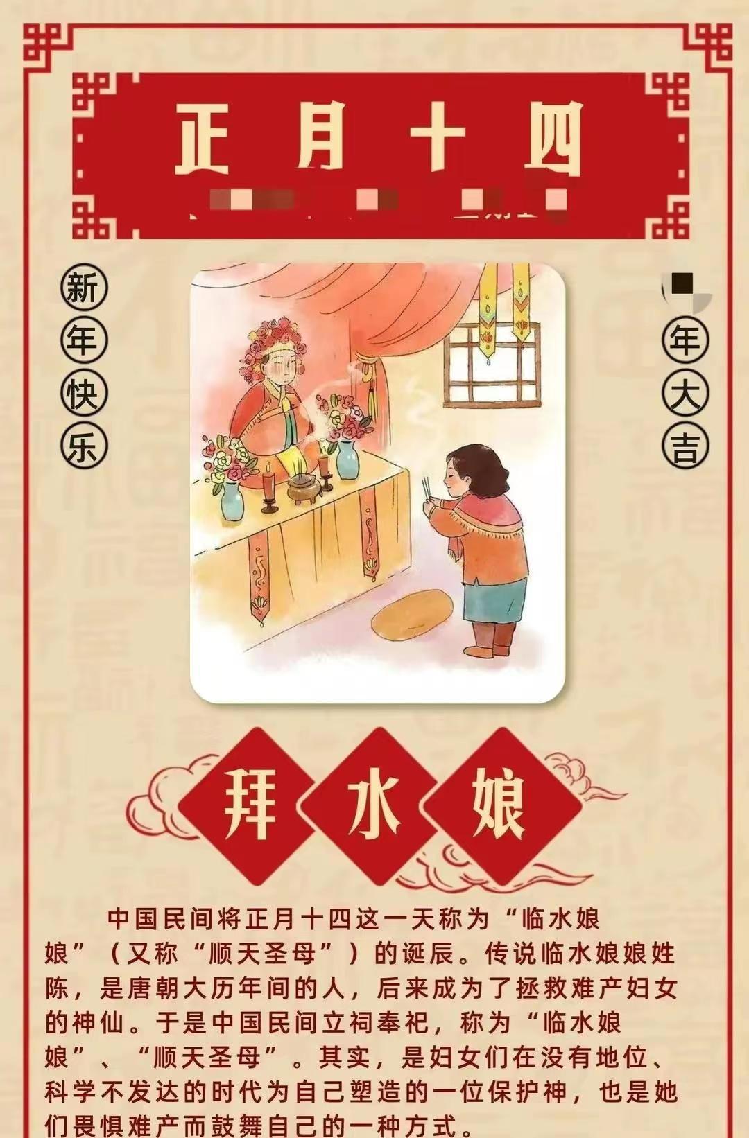 在正月十四在這一天,中國民間有拜臨水娘娘的習俗。臨水娘娘,又稱順天聖母,是唐朝大曆年間的陳姓女子,傳說中她成爲了拯救難產婦女的神仙。在那個科學不發達、婦女地位較低的時代,臨水娘娘成爲了婦女們心中的保護神。人們立祠奉祀,希望通過祭祀活動,祈