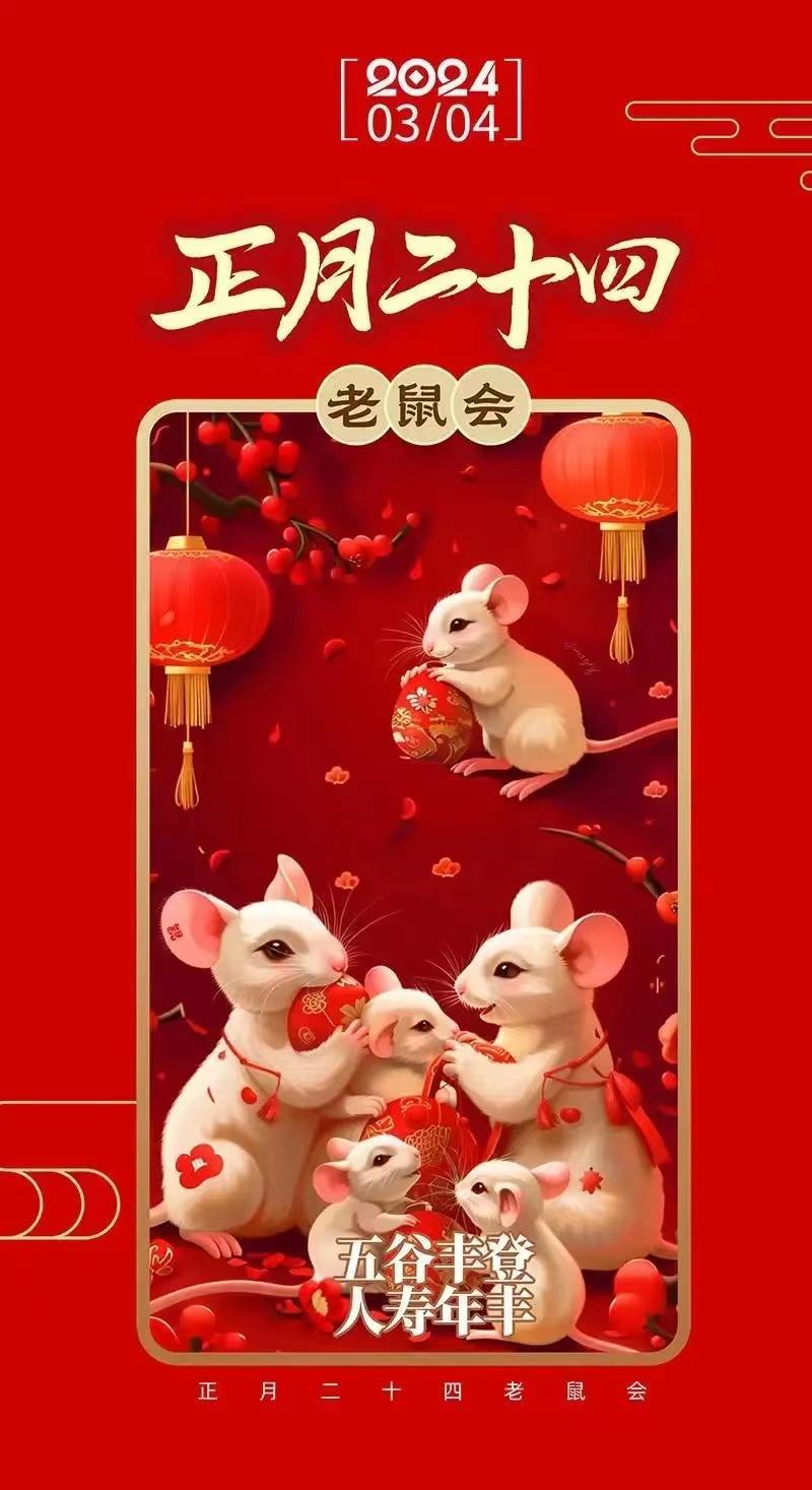 在農耕時代,人們渴望五穀豐登,希望糧食豐收、糧倉滿滿,但老鼠卻是個大麻煩,人們期望沒有老鼠來搗亂,希望老鼠不再破壞糧食。人們想方設法,要除之而後快!到了正月二十四這一天,這個“老鼠會”習俗,人們會用紅繩把家裏的剪刀綁起來,因爲剪刀一張開就會發出咔嚓咔嚓的聲音,就像老鼠在咬糧食一樣。人們把剪刀綁起來,象徵着希望老鼠不再破壞衣物、糧食等等,期盼有一個豐收的季節。
