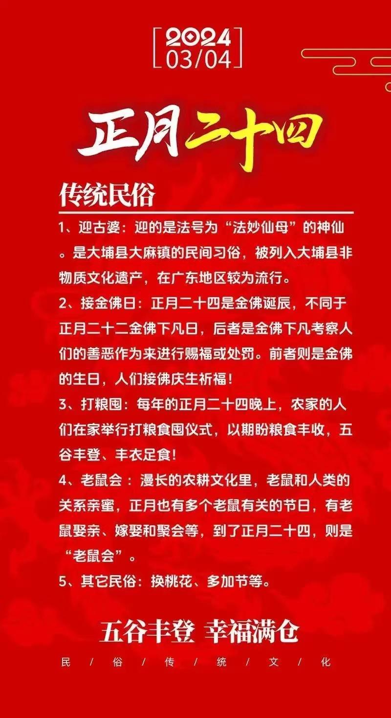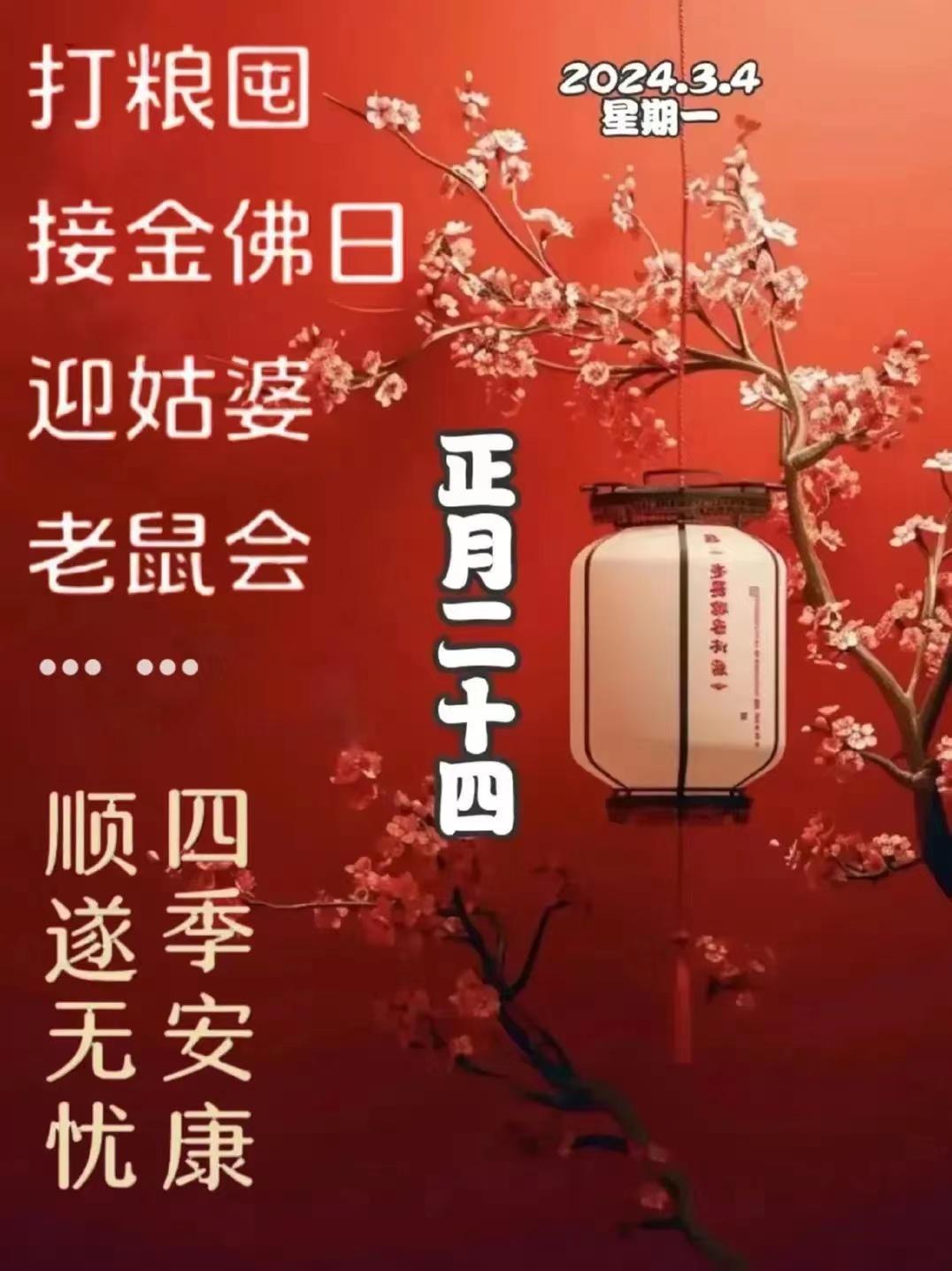 結語:正月二十四這些傳統民間習俗和禁忌反映了人們對美好生活的嚮往和追求,同時也體現了中華民族的傳統文化。時至今日,我們再次學習欣賞這些習俗文化禁忌的同時,也可以體會到古聖先賢的人生智慧,而今天其實它也可以作爲指導和參考建議,引導我們現代人更好的生活,繼承優秀的中華美好傳統。