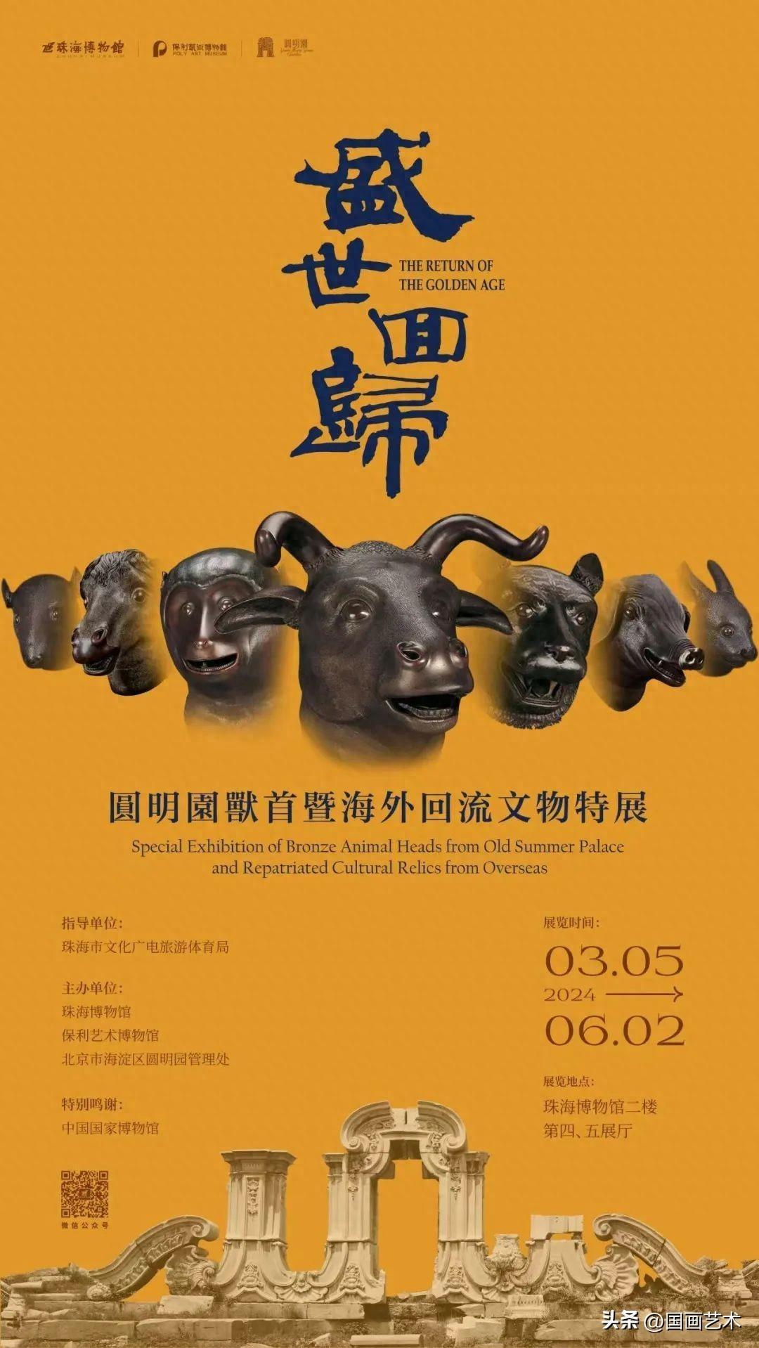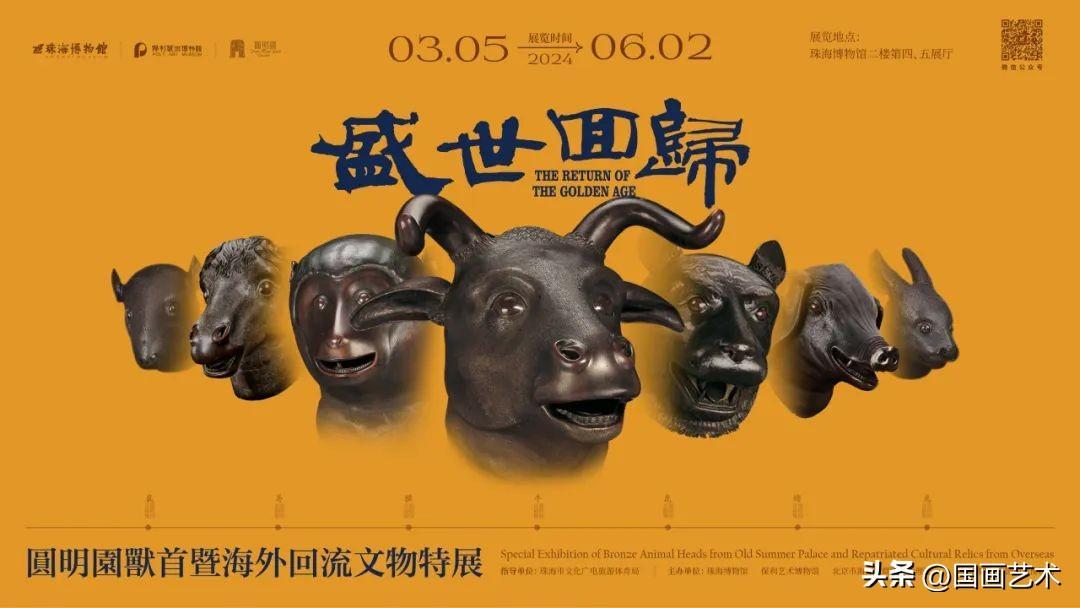 由珠海博物館、保利藝術博物館、北京市海淀區圓明園管理處共同主辦,中國國家博物館支持的“盛世迴歸——圓明園獸首暨海外迴流文物特展”於2024年3月5日在珠海博物館開幕。展覽分爲盛世聚首、青銅時代兩大板塊,將持續至6月2日。此次展覽的重點展品爲清代圓明園海晏堂十二生肖獸首之牛首、虎首、猴首、豬首(3月5日——4月6日期間展出文物原件,4月7日至6月2日期間展出文物仿製件),以及鼠首、兔首的複製品,馬首仿製品。還將展出保利藝術博物館藏部分重要青銅器藏品。此次展覽是“盛世迴歸”系列巡展於去年12月首次在鄂爾多斯市博物院展出了“4+3”的核心展品陣容之後的第二站。所謂的“4+3”,即保利藏4獸首原件,納入由北京市海淀區圓明園管理處提供的馬首仿製品,中國國家博物館提供的鼠首、兔首銅像複製品。