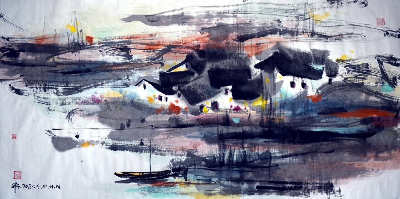 富饒的田野,美麗的村莊,寫意的水墨,別樣的情懷。是書寫還是描繪這田野村莊,似乎是把感懷呈現在畫面上,表現的歪好歪好,有情調有趣味有感覺更有畫意。彷彿隨意性而朦朧的意識宣泄在宣紙上顯現出的味道,滑溜溜的。