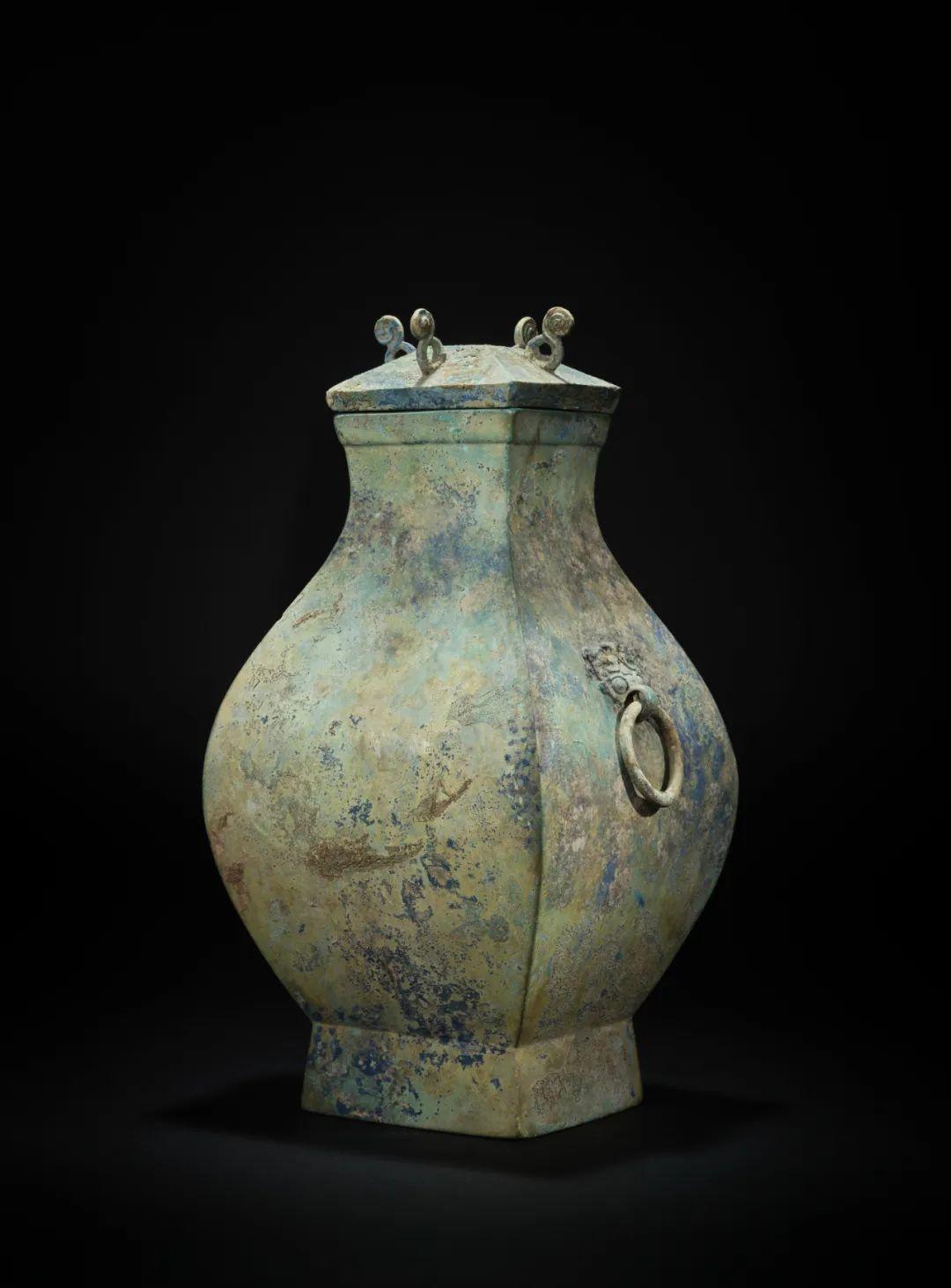 此壺圓鼓腹,頸細長,有蓋,矮圈足。有廡頂狀壺蓋,蓋平頂,四環鈕,鈕頂呈索狀,上腹部有二鋪首銜環。這是一件典型的戰國秦式銅方壺。