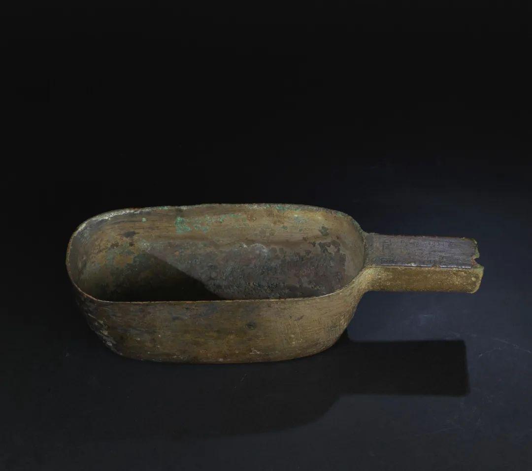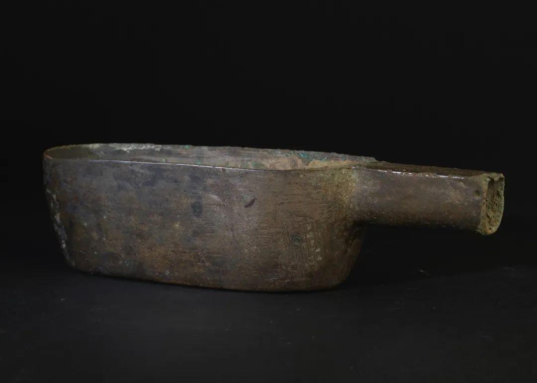 青銅質,橢圓形,直口收腹,平底,一側有上平下圓的筒狀柄。柄上有兩行刻銘,首行爲“四斤十二兩”,次行爲“宮,六升四分升”。“六升四分升”下可能有“一”字,今因鏽蝕而不可見。“六升四分開一”,即四分之二十五升。由此推算一斗約1920毫升。