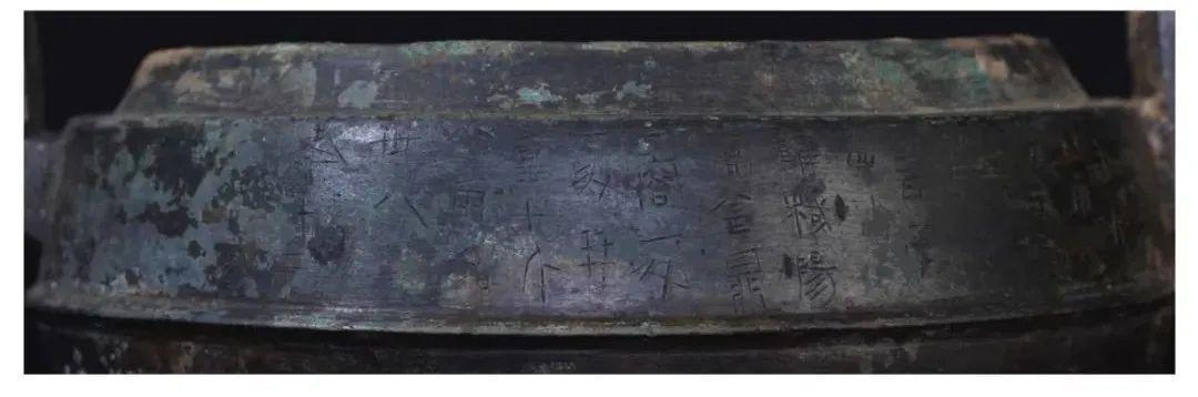 下面銘文:九斤八兩一斗。二百五十四。雍棫陽宮金(銅)鼎一。容一斗一升。並重十斤八兩。名卅八。今十斤。