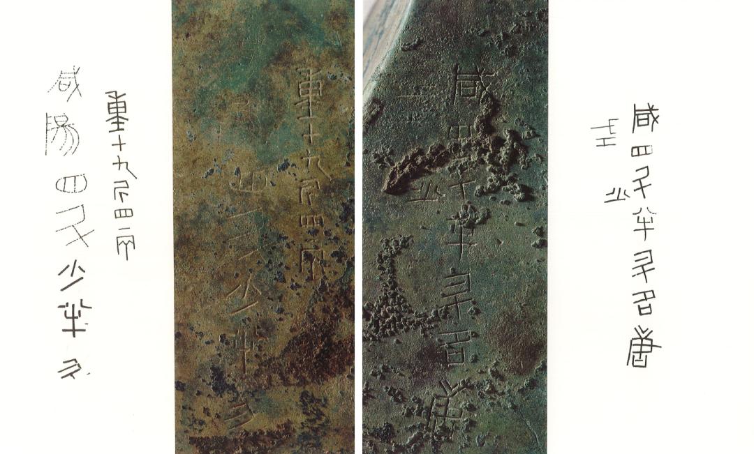 其腹部中間偏右刻銘兩行十二字。銘文中咸陽又省作“鹹”,可能是器物製造地。“少”讀爲小,“小半升”即三分之一升。秦時一斗約合2000毫升,一升約合200毫升。據此推算,壺容當在8066毫升左右。秦時每斤重240-250克,每兩約重15克,“十九斤四兩”,約重4800餘克。