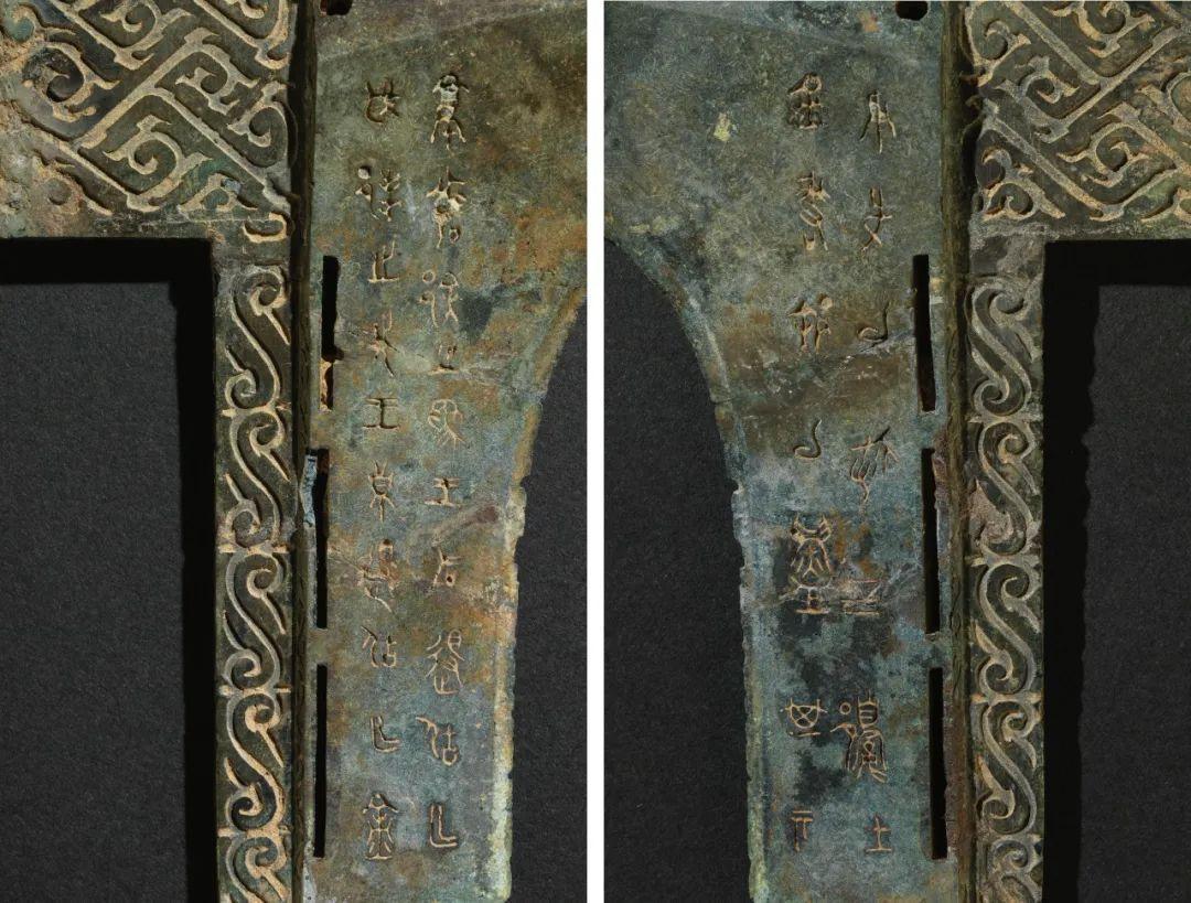 劍格兩面鑄有鳥篆銘文共八字,以雙陽線勾勒文字筆畫,筆畫以外的空處填綠松石爲飾,大部分綠松石已脫失。銘文可釋爲“戉王 戉王 者旨 於睗”。越王者旨於睗的銅器已有很多發現。據學者考證,“者旨於睗”是越王鼫與,又稱“鹿郢”,他是越王勾踐之子,公元前四六三年至前四五八年在位,共六年。