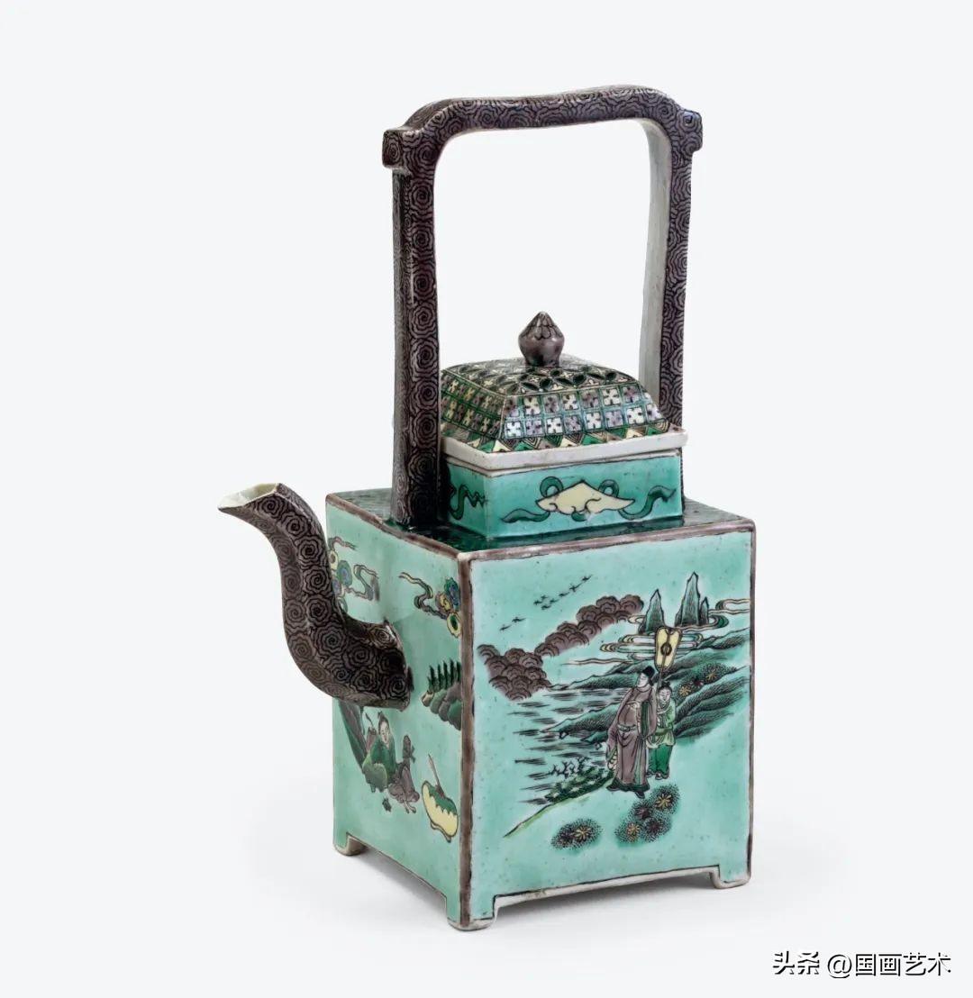 據清人寂園叟《陶雅》載:“西人以康熙黃、茄、綠三色之瓷品爲素三彩”,其中的“三”代表多數,不是確數。“素”特指此類器物不施紅彩。康熙素三彩器極富盛名,對比明代三彩,熙朝作品的不同之處在於省去釉下刻劃紋飾輪廓再填彩的工序,而是直接敷彩作畫,彰顯了此時素三彩器物燒造技術的高度成熟。在中國古代瓷器製作過程中素有“一方頂十圓”之說,相對於拉坯成形的圓器而言,方器製作和燒造難度更大。本品器型周正,毫無變形,極爲難得。目前所見清代素三彩器,多位晚清所作,康熙作品極爲少見,其中壺類多見圓形,四方提樑壺亦較爲少見。