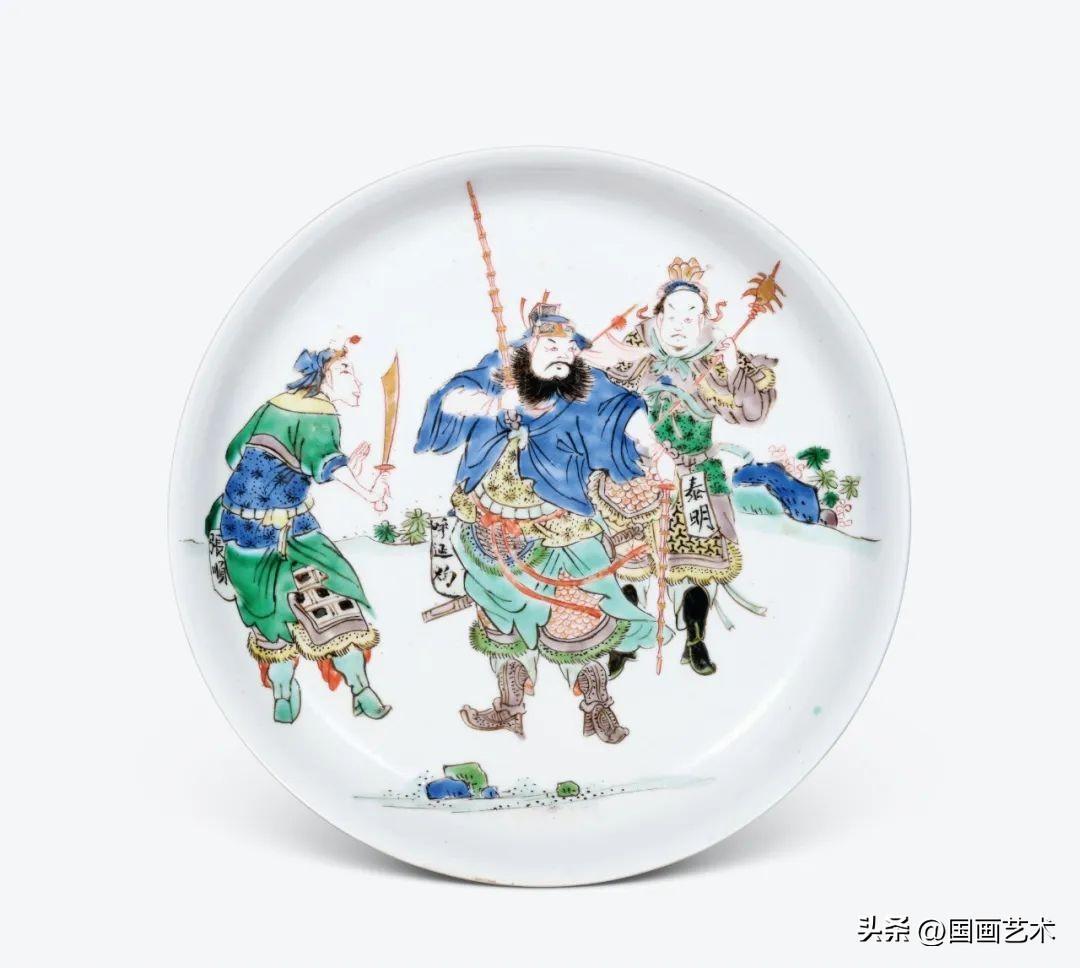 在繪有“人物畫像”式圖像瓷器中具體有一類,即以本場“問心齋”款瓷器爲代表的五彩水滸人物故事圖盤,盤的形制尺寸相類,人物構圖也極爲相似,目前所見,皆繪三個人物,構圖穩定,畫面簡約。此式五彩水滸人物圖盤見有三類:未落款者、“大清康熙年制”款者以及特殊堂名款者。