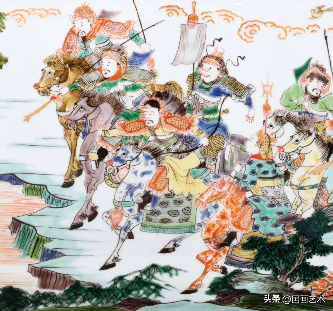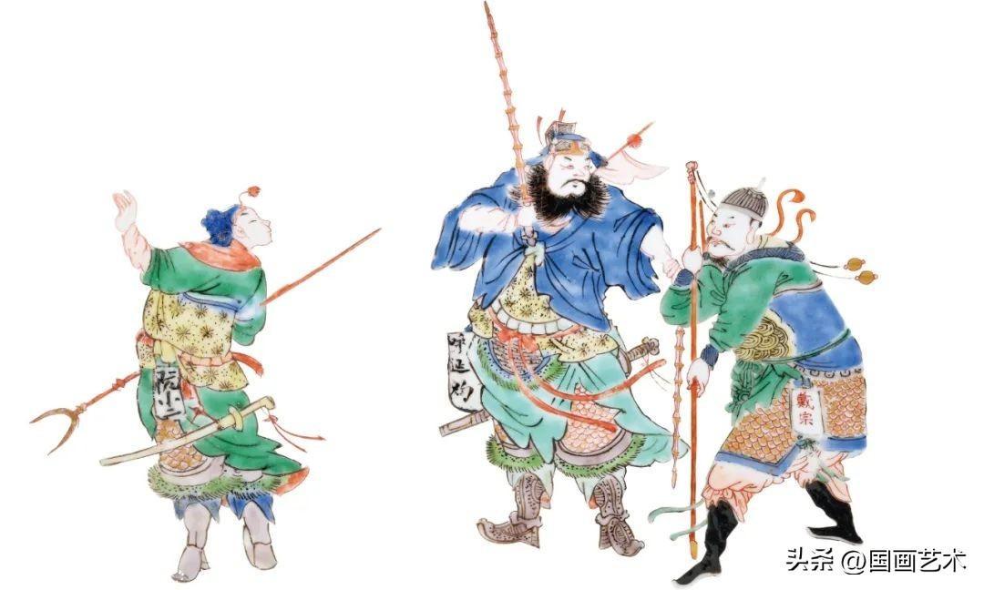 水滸人物是明末清初瓷器中頗受流行的題材,青花、五彩兼具,所繪依其表現形式可分爲故事圖像和人物畫像二種,前者圍繞故事情節展開,繪有具體場景,是對小說中某個情節的概括,此式圖像較爲常見,碗、盤、筆筒、瓶等皆可見此裝飾,後者注重人物刻畫,脫離故事,是對小說的人物性格描繪,如本場LOT1161-LOT1163,此式圖像更爲少見,且多見於盤之上,其他器型鮮見。