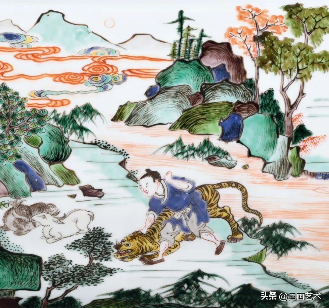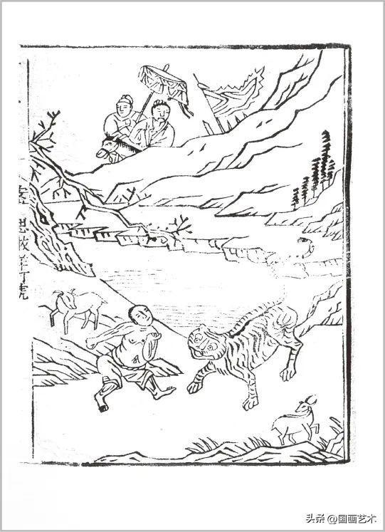 本品畫面中李存孝赤手空拳,騎虎欲揮拳,河對岸李克用一身戎裝,面露驚喜,推掌讚歎,身後一衆兵馬浩浩蕩蕩,更遠處仍有將士奔赴救駕。國家圖書館藏古籍《鐫李卓吾批點殘唐五代史演義傳》中,“安敬思牧羊打虎”一折所配版畫描繪即爲此場景,畫面中奮力打虎的李存孝、身邊羊羣以及遠山隱現的李克用,均與本品相合,可茲參證。