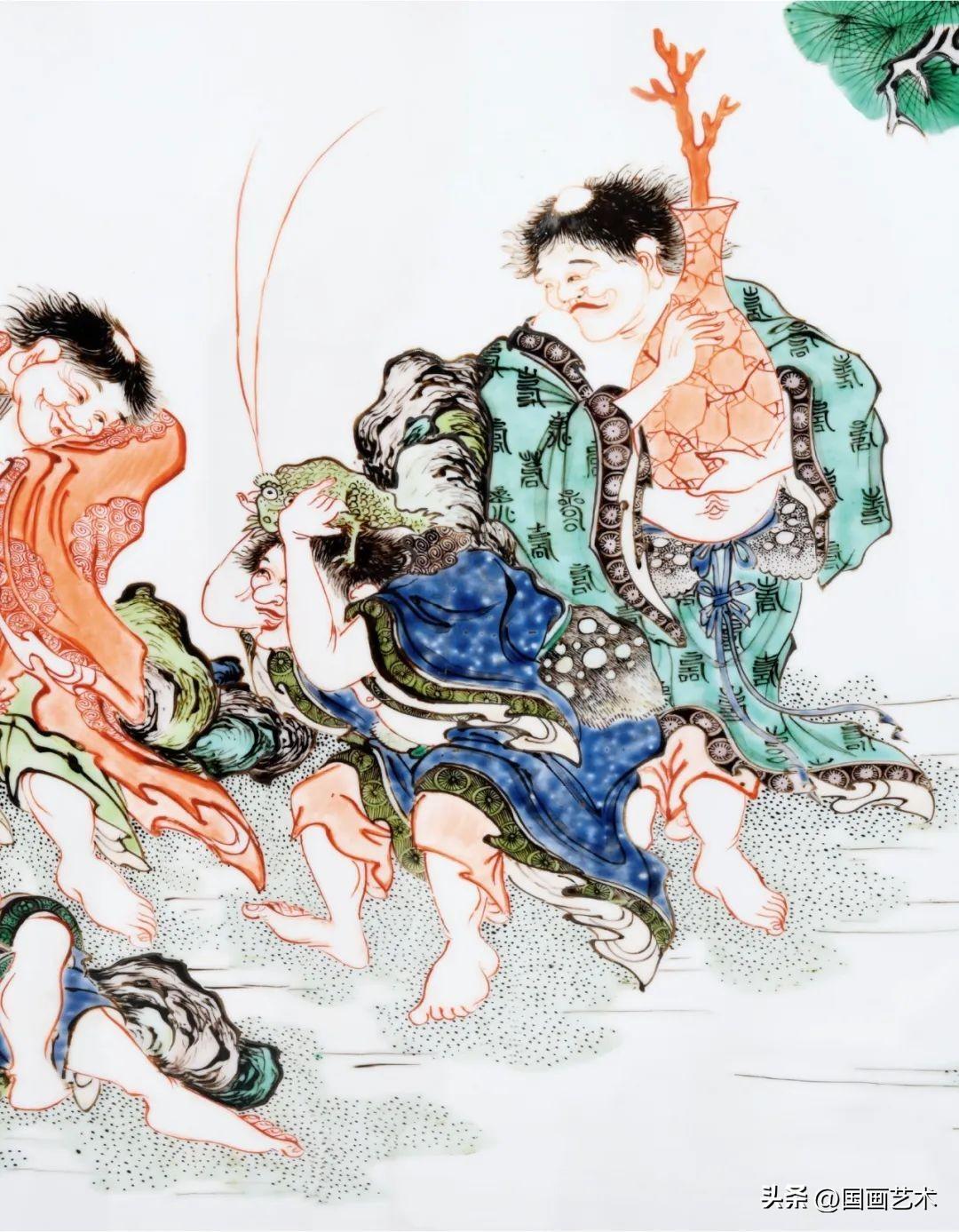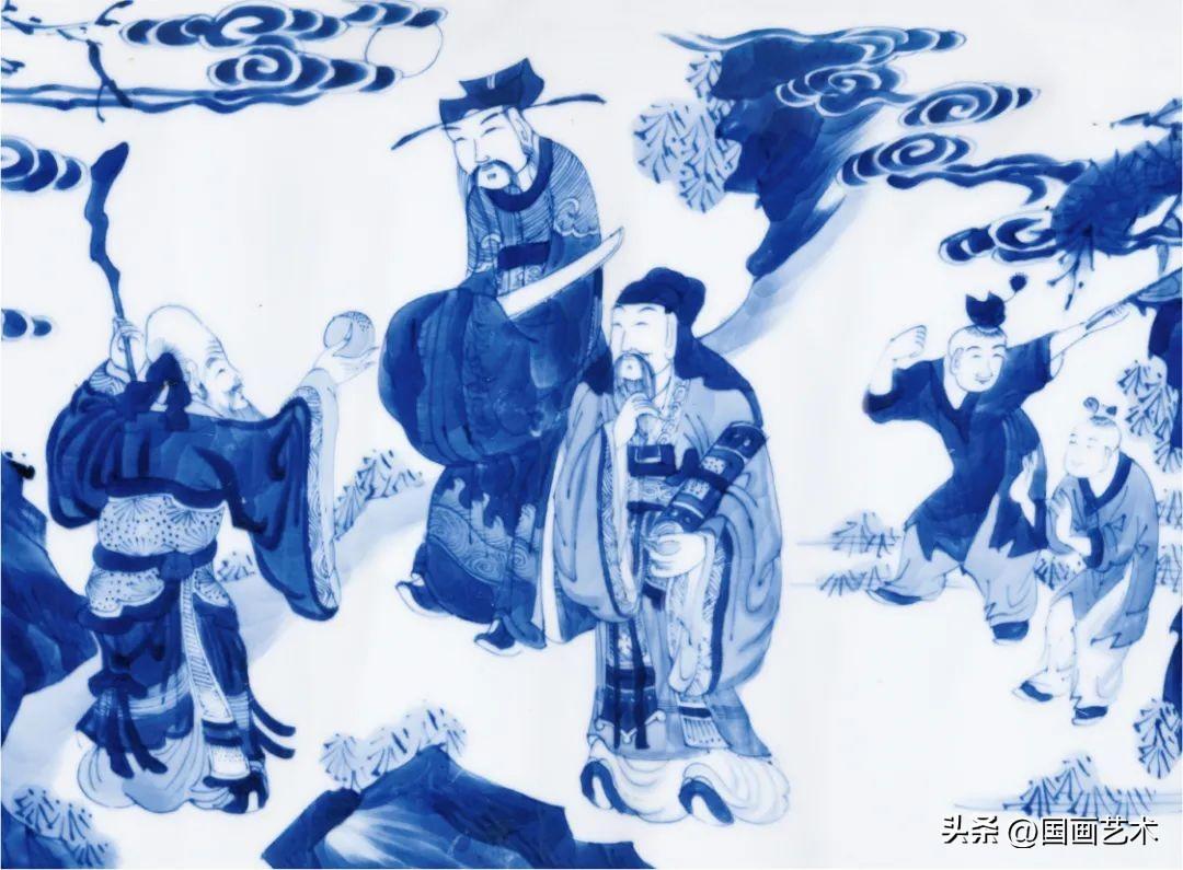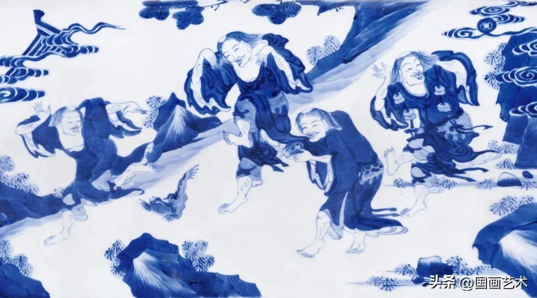 腹部青花通景繪四仙圖,四蓬頭仙人立於山林,劉海身背長串錢幣,喜笑顏開,身旁寒山、拾得與鐵柺李袒胸露腹,赤腳並立戲金蟾,一人捧方孔錢,三人圍金蟾,手舞足蹈。常見四仙圖中,四仙各有道具動作,而此處將三仙與“劉海戲金蟾”結合,形成四仙共戲金蟾之景,頗爲新穎。寒山拾得組成“和合二仙”,寓意夫妻和睦,幸福美滿,三足金蟾寓意財源廣進,民間有“劉海戲金蟾,步步灑金錢”之說。