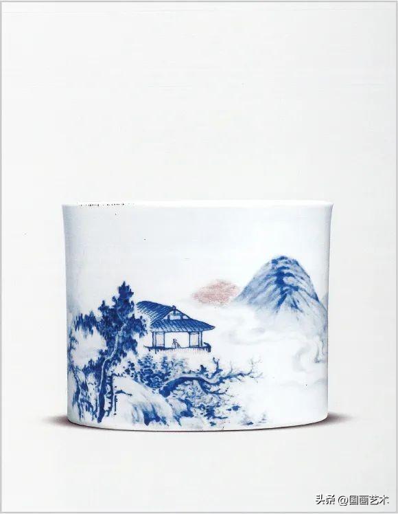 本品用筆蒼茫厚重,構圖層次變化,置景,用筆頗有文人畫的意味,堪稱康熙時期制瓷手工業高超技藝之代表,值得珍視。其遠岸渲染,留白展現河道,細密點皴樹影的技法均與“雄奇昳麗——十七世紀青花與五彩瓷特展”中一件康熙筆筒,十分相類。