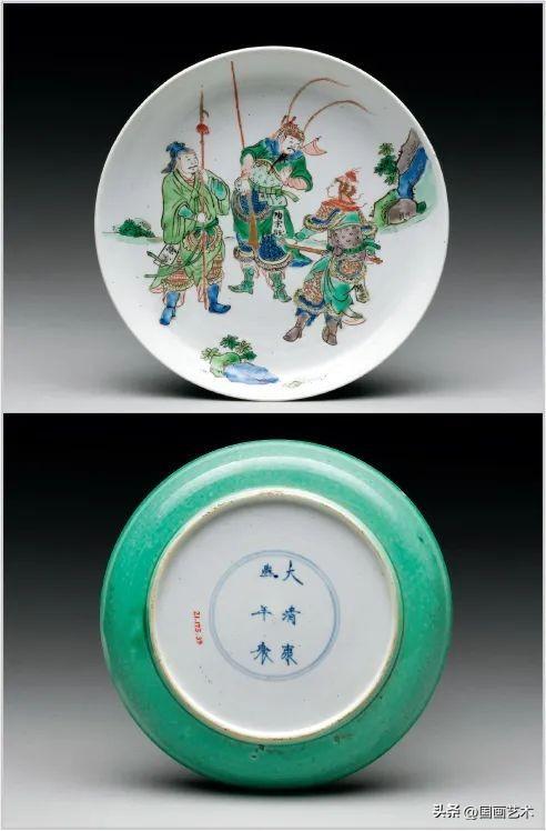 美國紐約大都會藝術博物館藏有一件康熙內五彩水滸人物故事圖外湖水綠釉盤,盤心繪徐寧,陶宗旺與施恩,亦落“大清康熙年制”六字雙行楷書款,尺寸、書款方式與本品一致,兩件應爲同批燒造。