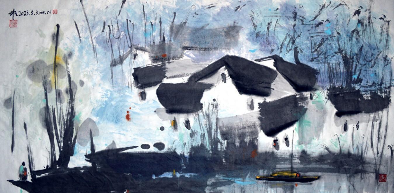 內涵破譯了形式的造化,遐想擺脫了形態的侷限,點綴成了萌發的起點,境界在空靈中展現出無邊無際的慢待。自然不具體、村莊不具體、人物樹木不具體,像似鬆散的契約架構,模棱兩可之間似畫非畫表現的意猶未盡。彷彿一種流露而非刻意,造化出似是而非的繪畫現象意念繪畫。沒有很具體的形態、比例、色彩的呈現,只有寫意畫的朦朧與詩性散漫狀態,彰顯出領悟與契約的不二之選格調,而且是堅定而自信。沒有彷徨,沒有躊躇,情懷篤定在繪畫表現之上顯出高尚。