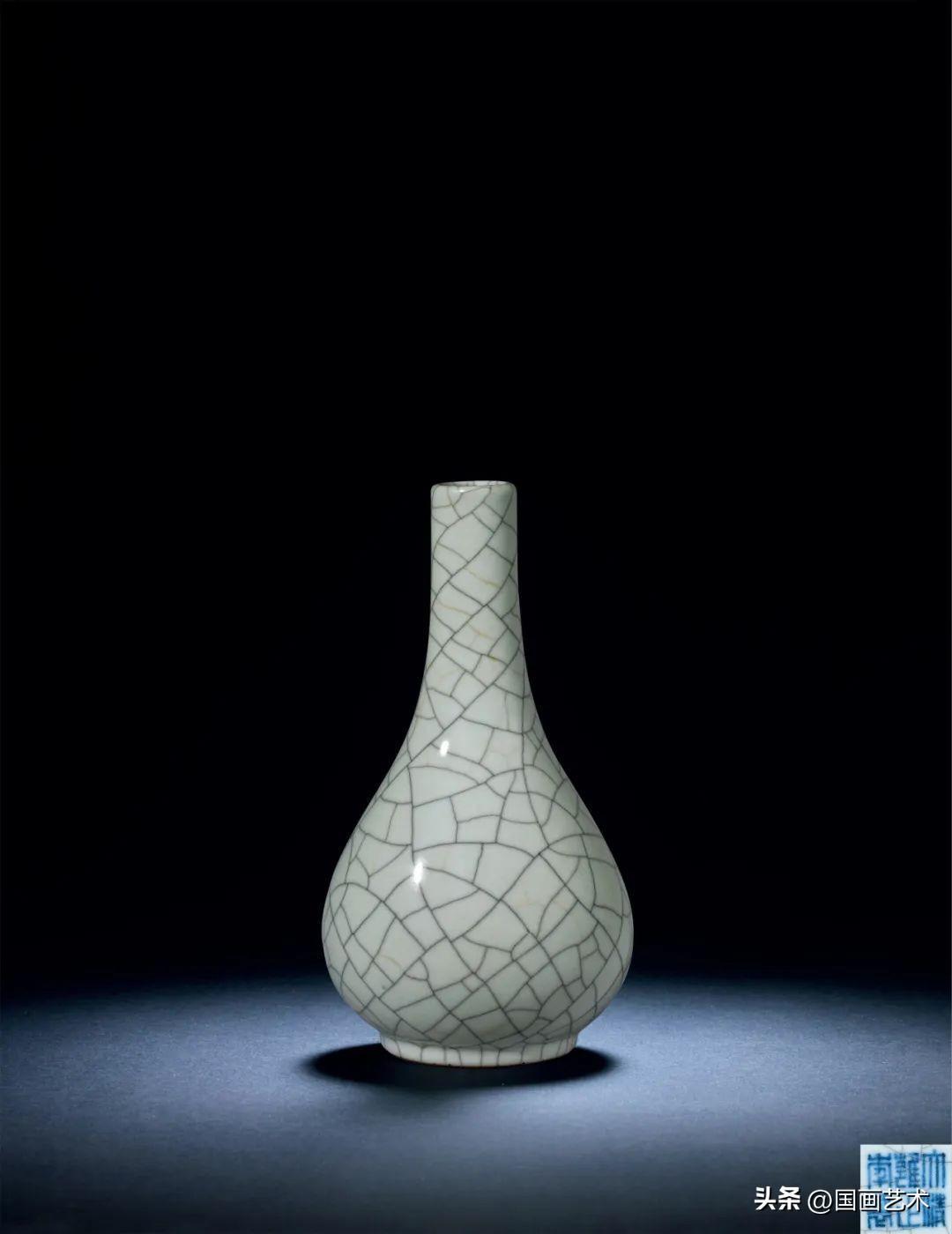本品無論器形、釉色,均仿製宋代哥窯器,原形可考臺北故宮藏一例,曾展覽於美國大都會博物館,出版於《Treasures from the National Palace Museum》,紐約,1996,圖版123。膽瓶造型俊秀,挺拔大方,古樸凝重,堪稱雍正官窯仿哥釉器箇中翹楚,保存良好,殊世罕見。本品無論器形、釉色,均仿製宋代哥窯器,氣泡密集似“攢珠”,足際刷鐵黑色釉,仿宋哥窯典型的“紫口鐵足”特徵。這一形制僅見於雍正官窯,乾隆以後不見,彌足珍貴。另參考二例清代仿製之例,收藏於北京故宮博物院,見《故宮博物院藏文物珍品全集:兩宋瓷器(一)》,卷32,香港,1996年,編號35及36,後者下腹略窄。《故宮博物院珍藏及出土哥窯瓷器薈萃》,2017年,頁268-69,編號131。
