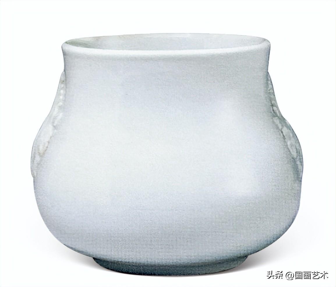 “摩羯”爲佛教語,或稱“魚龍變紋”,是一種長鼻,利齒,魚身的水獸,其形象來源於鯨、象、魚、鱷等動物。是此拍品兩側之摩羯魚耳,刻劃工藝極爲精巧細膩,與簡約純粹、光素無紋的器身形成鮮明對比,爲沉靜雅緻的器型增添了幾分靈動生機,頗有畫龍點睛之妙。