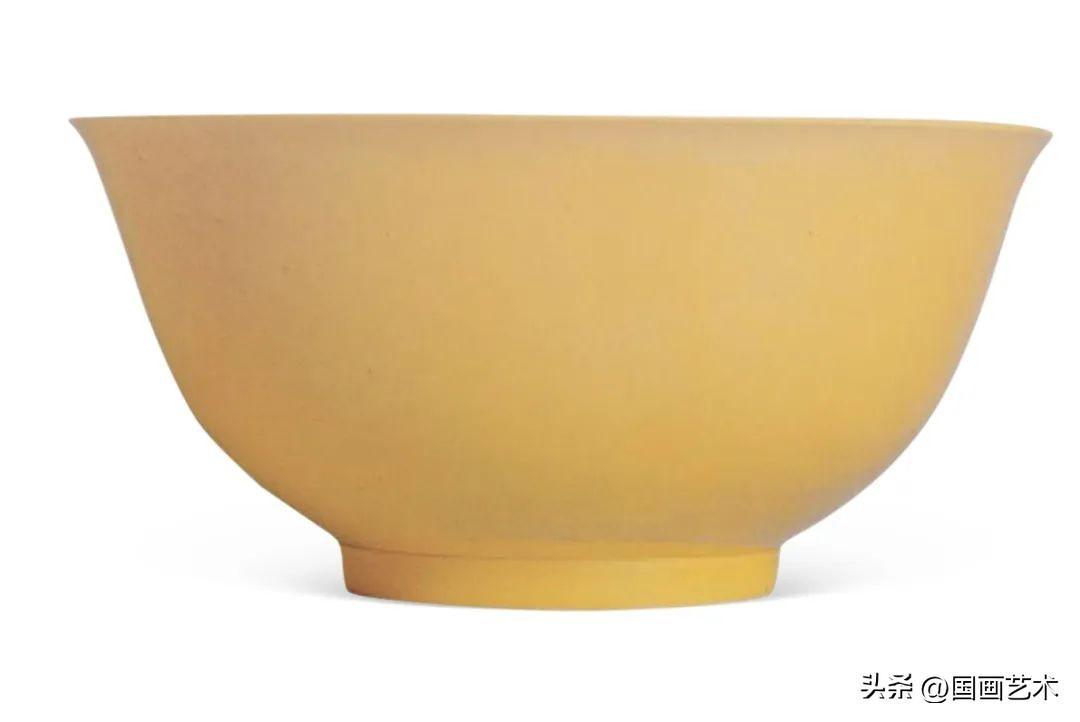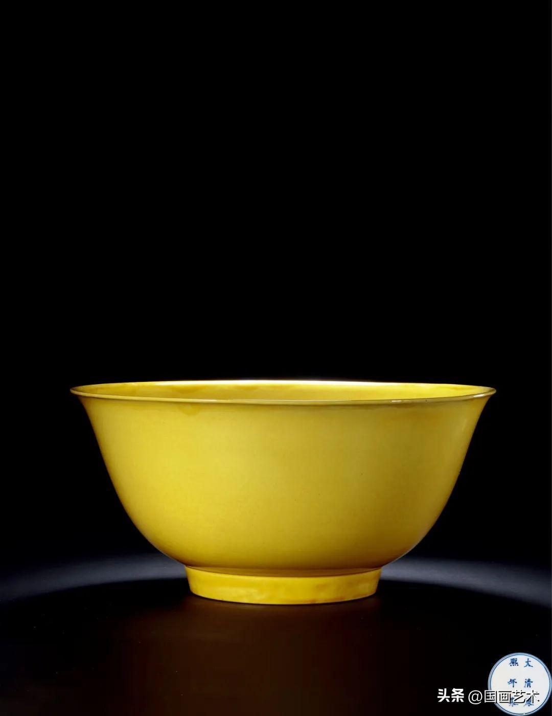 口徑31.2公分的黃釉大碗,是八十年代唯一一次經國家批准特許出口文物中的一件,原藏故宮博物院,爲清宮祭祀用品。此類碗明顯以清宮藏嘉靖年制器作摹本。明嘉靖九年定四郊各陵瓷器的顏色中,黃色爲方丘之器,方丘爲祭地神之所,清初沿襲此定製,本品當爲此而燒製。此種內外均施黃釉瓷器在清代宮廷被稱爲“黃器”或“殿器”,品級尊貴。據《國朝宮史》:“內外黃釉者,爲太后、皇后所用。”康熙一朝,御窯廠復燒爲內宮供瓷,藝匠自前朝如嘉靖瓷作中,獲得不少靈感巧思。因此相類瓷碗,相信燒製於康熙初年。