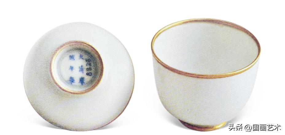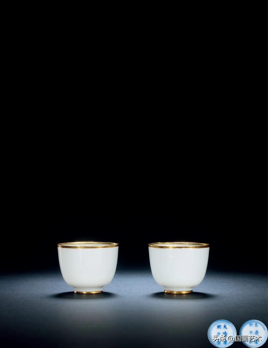 此對酒杯尺寸精緻靈巧,或列官窯酒杯中最小之流,加之其造型簡約,釉質瑩潤,尚古雅緻,實爲皇家貴胄飲酒享用之佳器。上海博物館藏一對相似例,錄於《上海博物館藏康熙瓷圖錄》,1998年,編號230。故宮博物館藏四件白釉青花四字小盅,較之尺寸稍大且無包金扣裝飾,然器型款識相類,亦可資參考。臺北故宮藏有一例清乾隆胭脂紅釉包金扣杯及盞,其裝飾效果與本拍品相同,爲同一工藝延續。