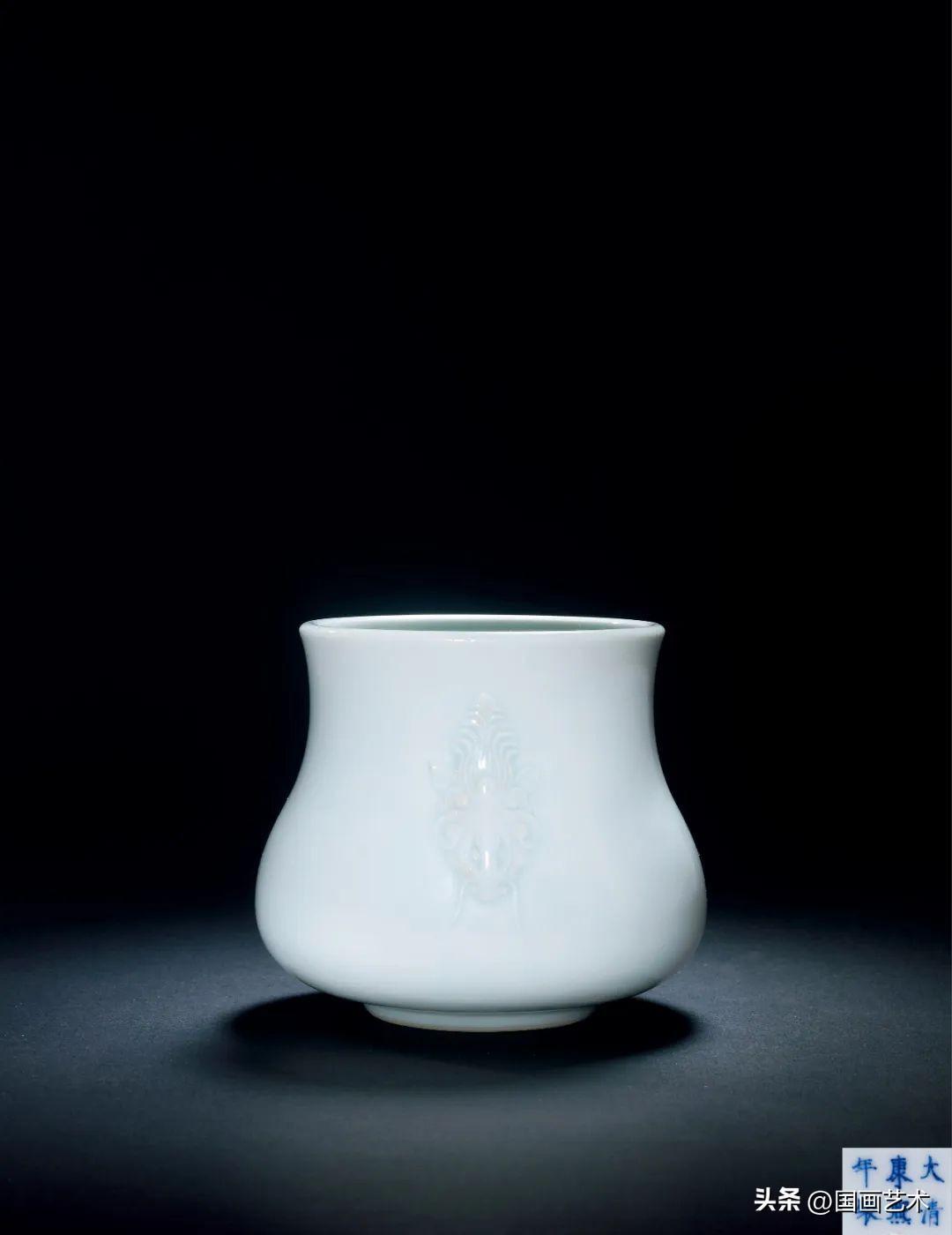 此爐造型優雅流暢,小巧玲瓏,釉色仿南宋影青之風韻,白中泛青,青中閃白,美如青玉,釉層較宋代青白瓷更爲晶瑩肥潤,令人愛不釋手。左右兩側摩羯魚耳精緻非凡,葉形目,如意耳,毛髮沖天,根根分明,面部兩側各垂一須,栩栩如生,威風凜凜。