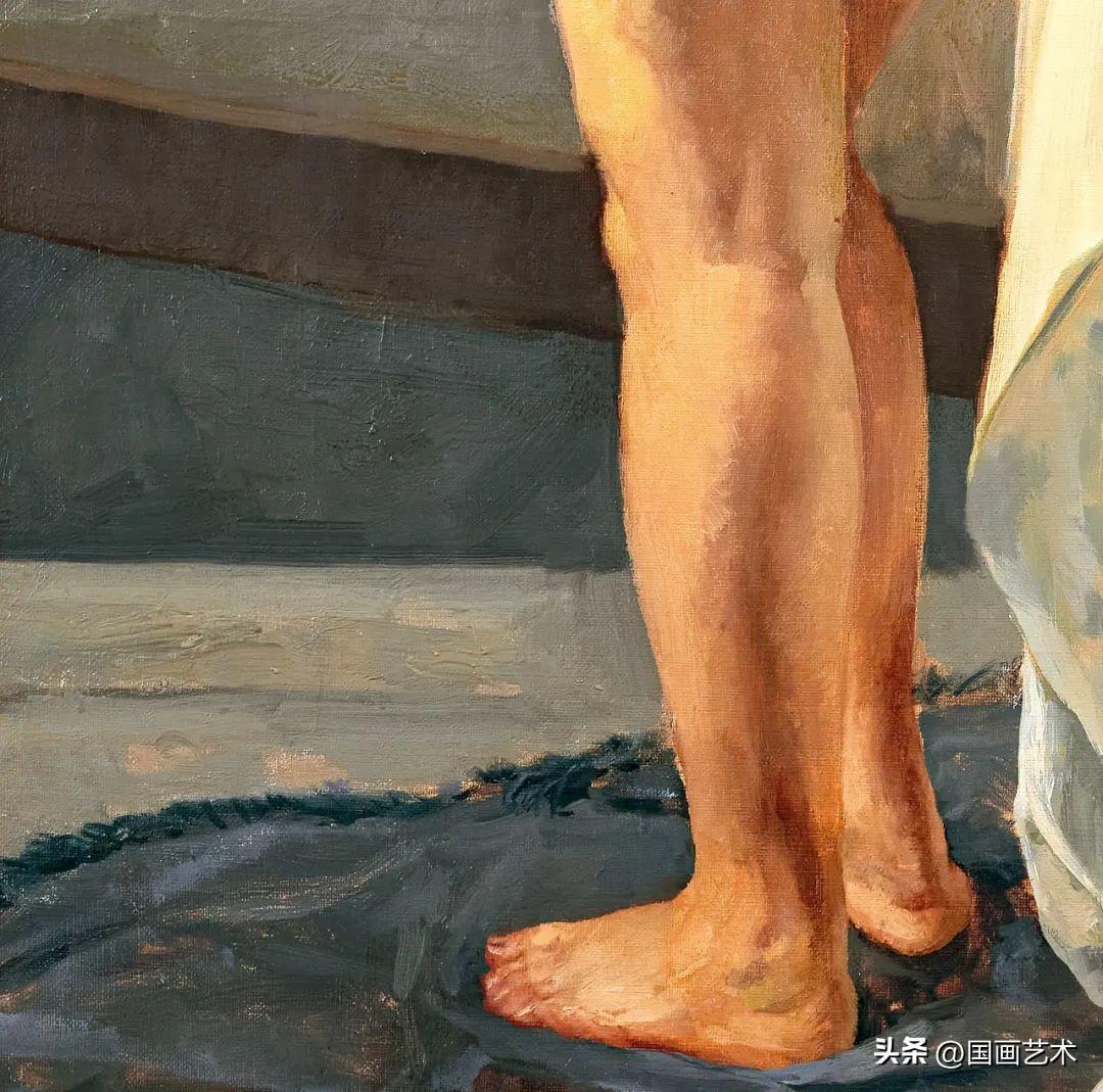 有別於西方學院派中過於追求完美、精心雕琢的人體造型、展現強烈骨骼和肌理的表現,吳作人在此以恣意的大筆觸,真實還原了畫中女子具生活感的體態,以及帶着生機、回首側望的神情。他在背景和中心處充分把握「光影、色彩和人體結構」的巧妙關係,將主角與不同的背景塊面進行銜接,從而強化「光的動態」。