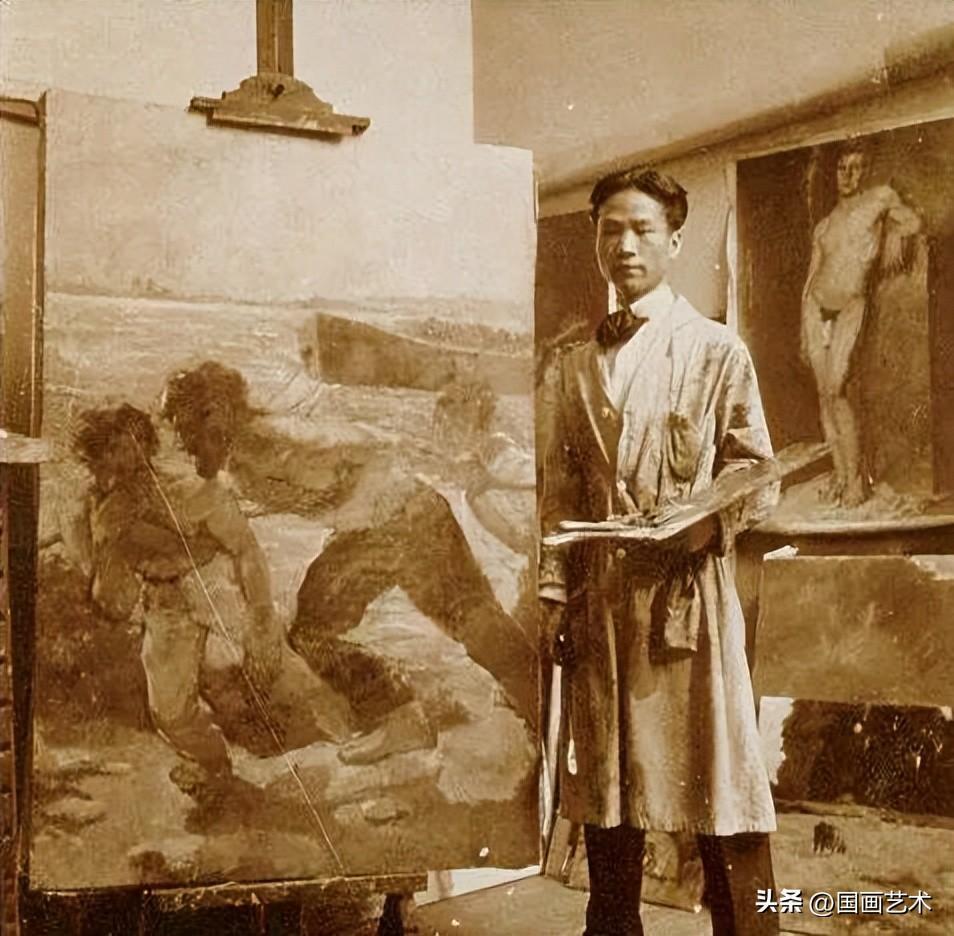 吳作人攝於比利時畫室,左側爲其名作《縴夫》