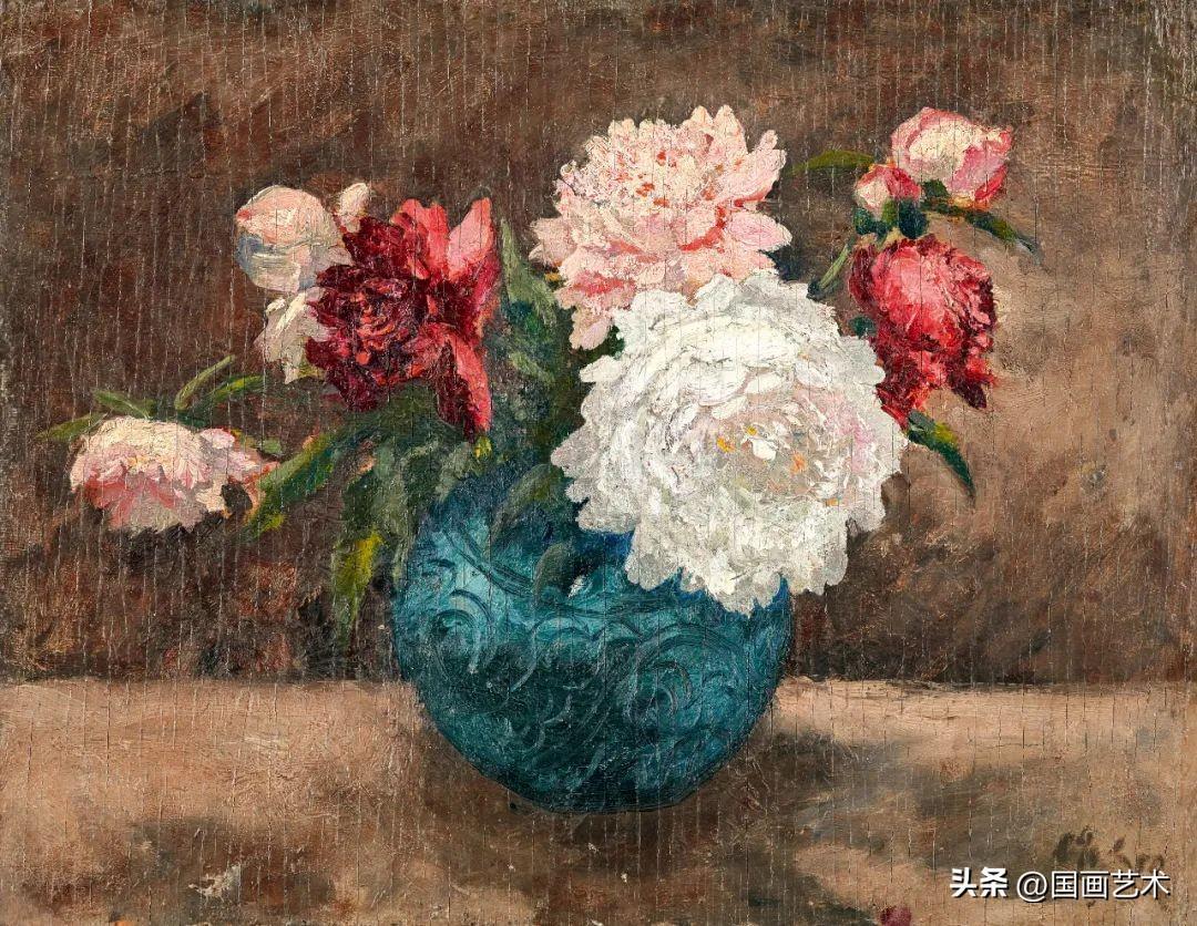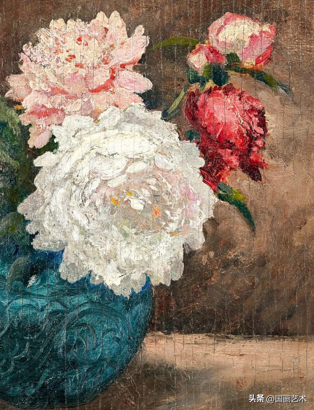 他以暗棕色背景作襯,有意識地將畫面以一種古典的暖調呈現,並加強冷暖色階和頂光效果的對比、弱化花與葉、花與瓶之間的對比,從而呈現結構性的統一。如見桌面的水平線與橫向的綠枝呼應,球形的花瓶與圓狀的白色芍藥花朵構成對照,正展現出古典靜物的「高度均衡感」。而在筆法上,他跳脫了傳統靜物寫實的逼真之細,以帶有「傳神寫意」的技巧,在鬆動、自然、具水墨般流動的筆勢中,吐露出淡淡的東方美。作品將芍藥花「富貴而美麗」的氣質,以明媚又清麗、怒放中帶含蓄的獨特方式展現,獨具格調。