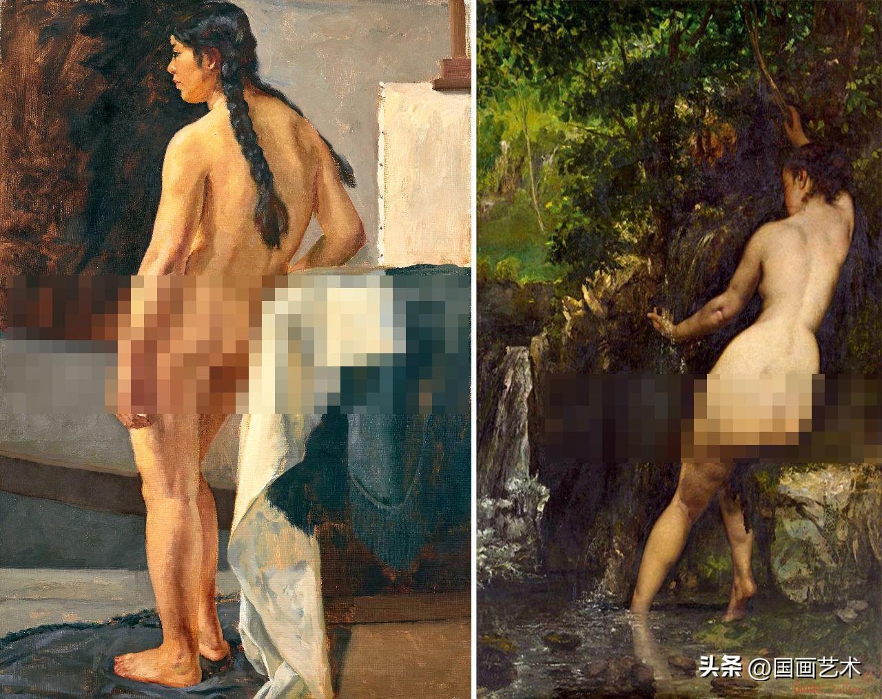 右:庫爾貝《泉》,油彩畫布,128×97.5cm,1919年作,巴黎奧賽美術館藏。吳作人將西方的明暗對照光影技法爲其所用,並在此基礎上,再度演繹爲多重背景色的塊面綜合,以不同的布料反襯人體不同部位在光源下的差異
