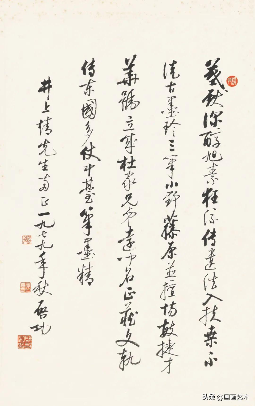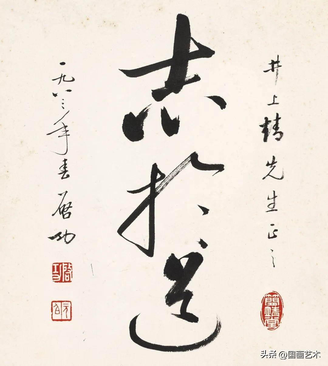 說明:1963年秋,日本書道界、文化界上上下下熱烈歡迎中國書法家代表團。日方的接待單位是日本戰後成立的強大的書道統一團體——全日本書道聯盟,以及爲了便於與未建交國進行文化交流而設立的日本書道文化聯合會與日本中國文化交流協會。日方三團體爲潘天壽等書畫家安排了極其充實的日程。在日逗留的29天裏,既安排參觀訪問了東京國立博物館在內的10家博物館數據庫等,還特別走訪了豐道春海、西川寧等20名日本知名書道家收藏家的私邸及參觀了保持着古風的筆墨紙等傳統作坊等。參觀交流,拜訪敘舊,座談揮毫,頗有廣度和深度地增進了藝術家之間的相互理解和友情。此圖即爲當時寫贈。