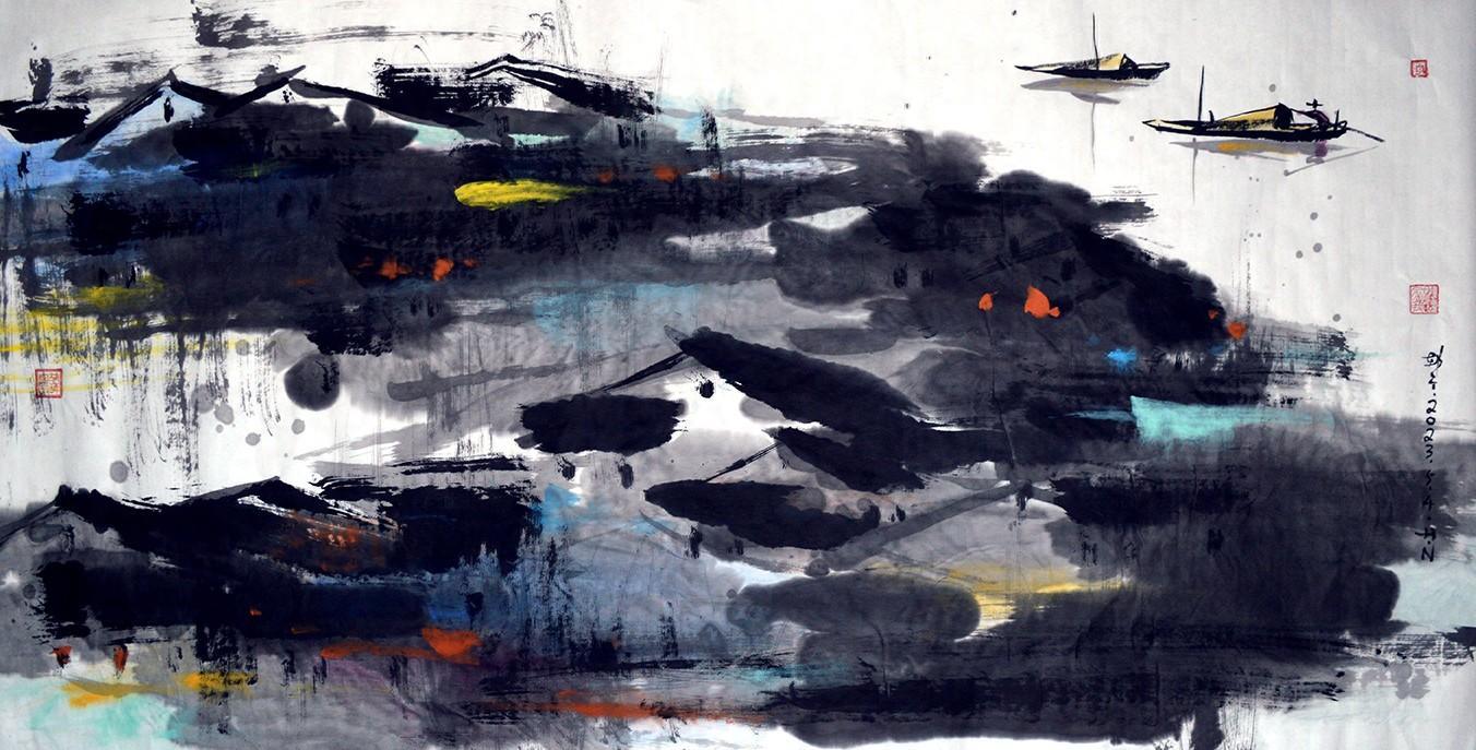 與田野融爲一體的村莊,白牆黛瓦建築有時跳躍性的點綴在這單調乏味的色調之中,拉開了視覺上的對比關係,畫面顯得生機盎然。水鄉、靈性、豐腴都體現出詩情畫意的形態,潤澤在溼潤的湖泊之中。一切都那麼富有情調,演示在輕描淡寫之中。生活就是這樣活脫脫的展現着一種情懷與一種狀態,需要透着美好、理想又拉近真實性的距離,變爲可摸得着感受得到的可具體呈現的生活,甚至是斑駁、朦朧而只有感觸沒有意念的穿透。