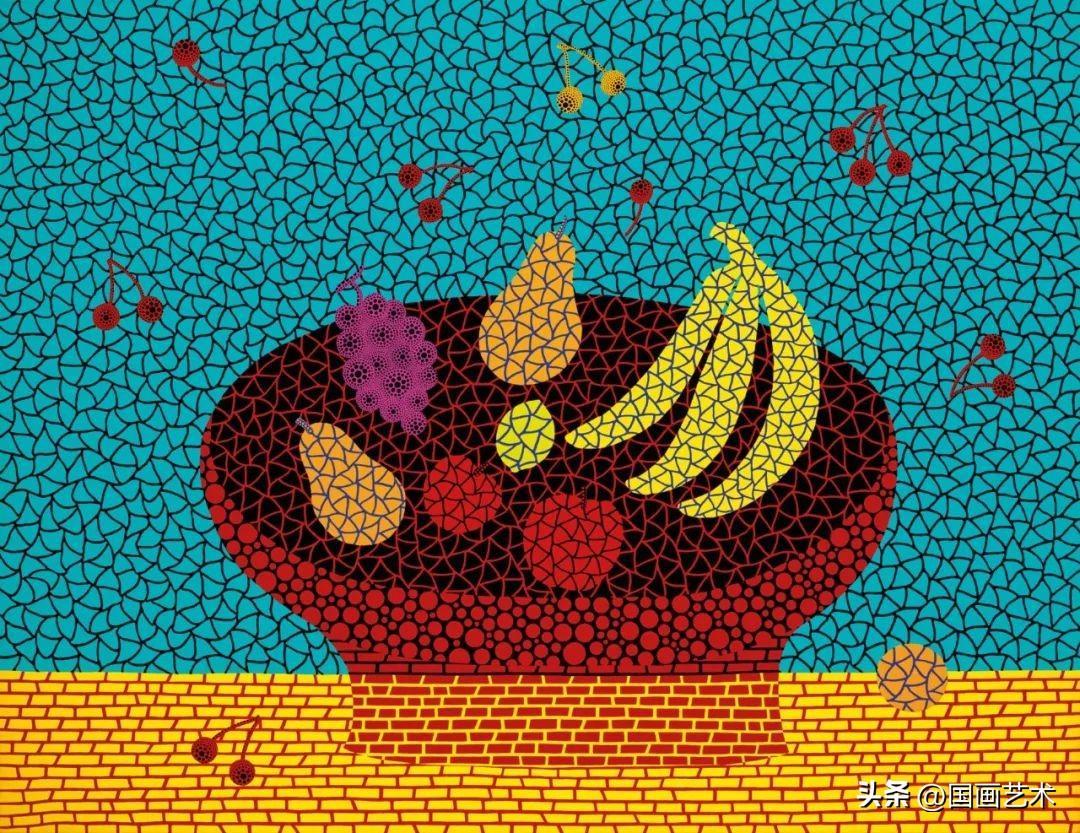 此外,畫作中背景、櫻桃、梨、蘋果和香蕉錯綜複雜的幾何排列體現出空間關係背後的邏輯,以及草間彌生對物體與空間關係的深刻思考,顯示出藝術家創作技藝的卓越提升及自我驗證。