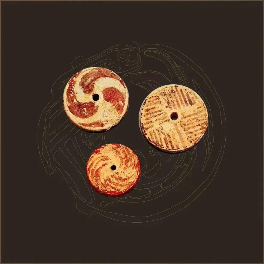 彩陶紡輪直徑3.1-4.3釐米,是石家河文化早期最有特色的陶器。色彩有橙黃、橙紅、黑褐、紅褐等。