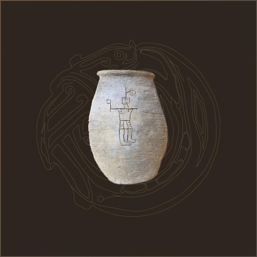 羽冠持鉞人像陶罐於肖家屋脊遺址出土,灰陶罐表面刻有頭戴羽冠、手持斧鉞、足蹬長靴的人物圖像。鉞在史前時期代表着軍權與神權,這件陶罐是一件祭祀通天的法器,刻劃人物應具有溝通上天的能力。