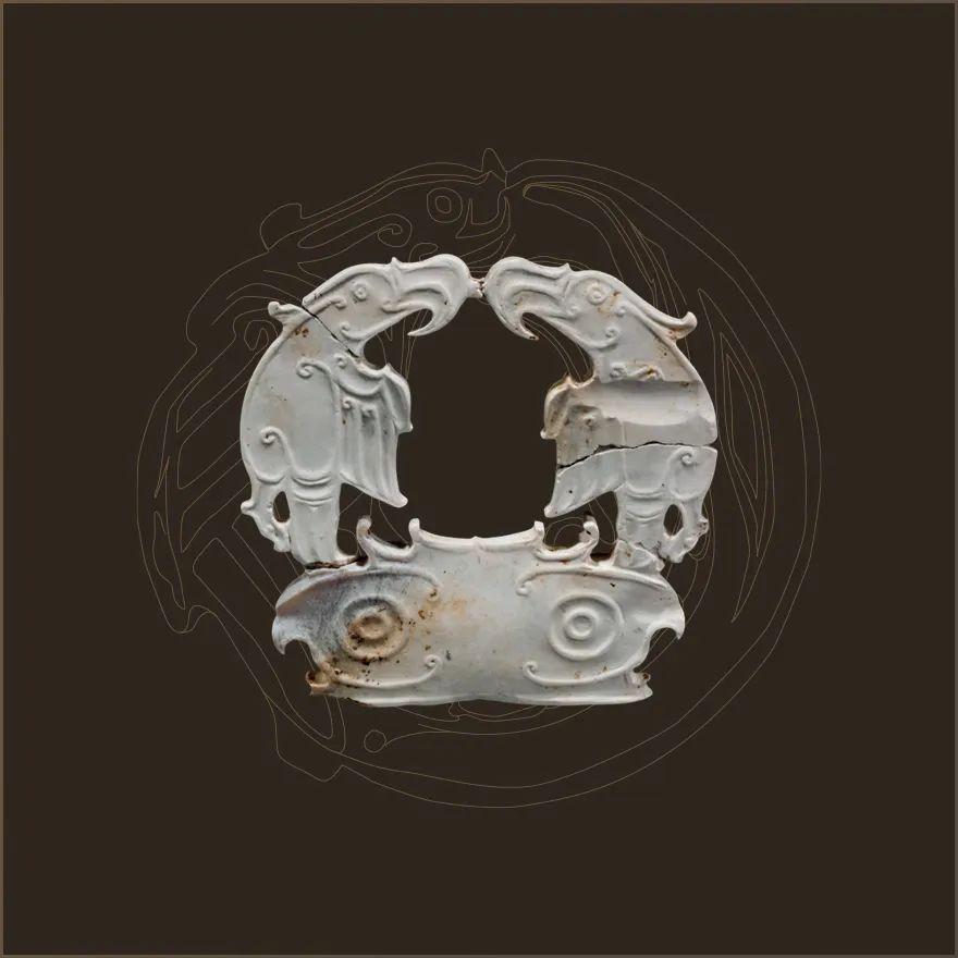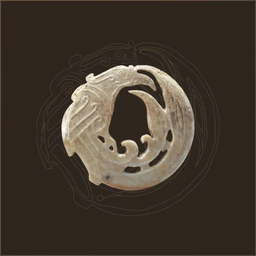 石家河遺址的玉鳳於1955年在羅家柏嶺遺址出土。玉鳳呈雞骨白色,首尾相街呈團鳳形。雙面鏤空透雕,長冠尖喙,短翅長尾,爪臥腹下。紋飾使用減地凸起陽線的琢刻技法,腰琢圓孔,可用於系佩。此器造型秀美,線條遒勁流暢,細部刻畫精緻,代表了石家河文化的琢玉水平。