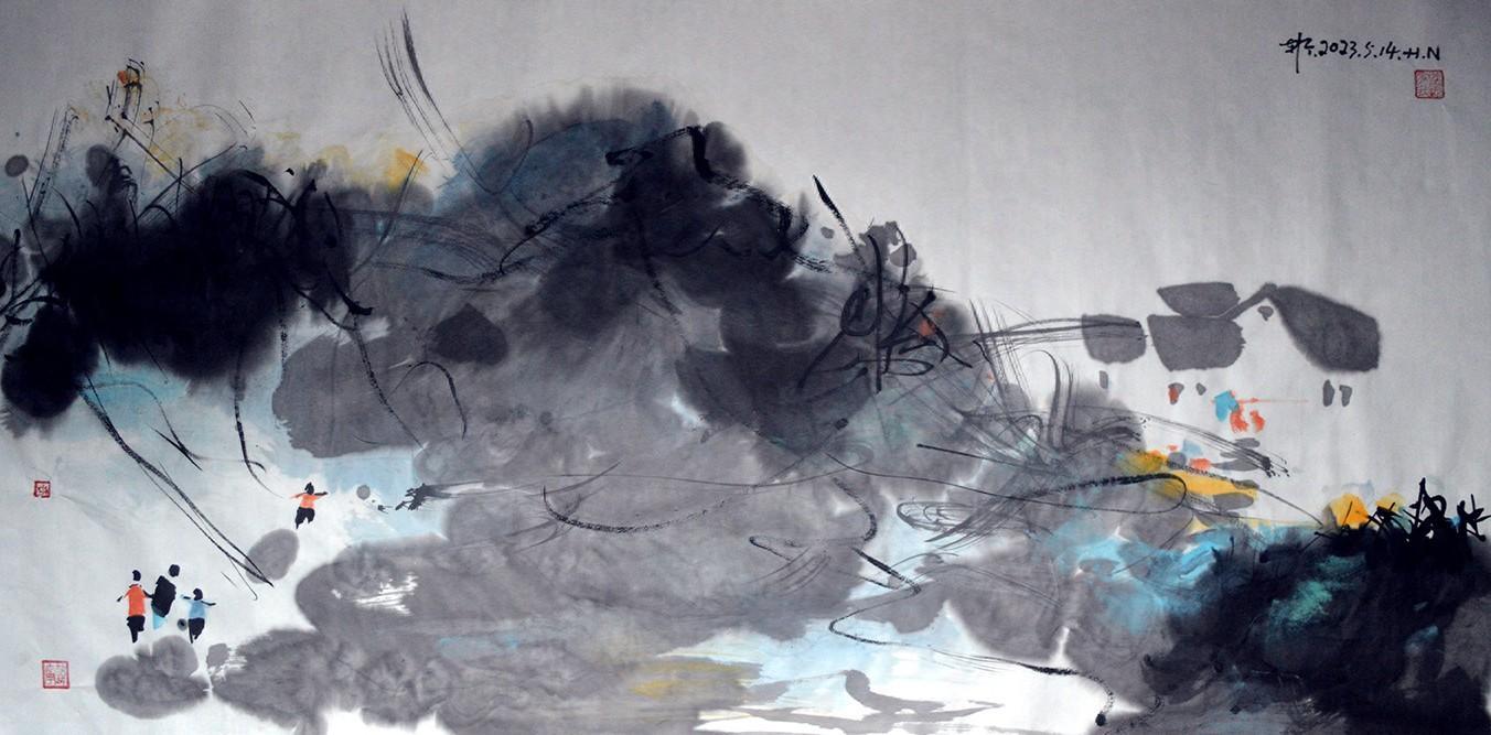 鬱鬱蔥蔥的樹林水墨畫怎麼表現,是幾筆帶過還是一筆一筆把樹的形態刻畫出來呢?我考慮前者,我從畫面整體視覺效果出發來決定,比如點線面的構成,相互對比關係等等,而非從一個兩個事物形態的角度出發來表現它們的具體特徵。情懷的抒發是要又灑脫又抽象又概念性的表現出一揮而就、一氣呵成的氣勢,要把熱烈奔放的情懷四溢滲透到紙背上,這樣纔會使得我們的作品具有感人至深的力量。