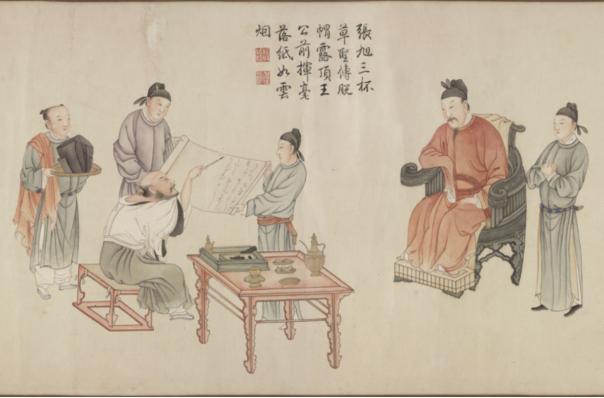 大書法家張旭飲酒三杯,即揮毫作書,因爲其草書驚豔絕倫,時人稱爲“草聖”。他常不拘小節,在王公貴戚面前脫帽露頂,揮筆疾書,若得神助,其書如雲煙之瀉於紙張。