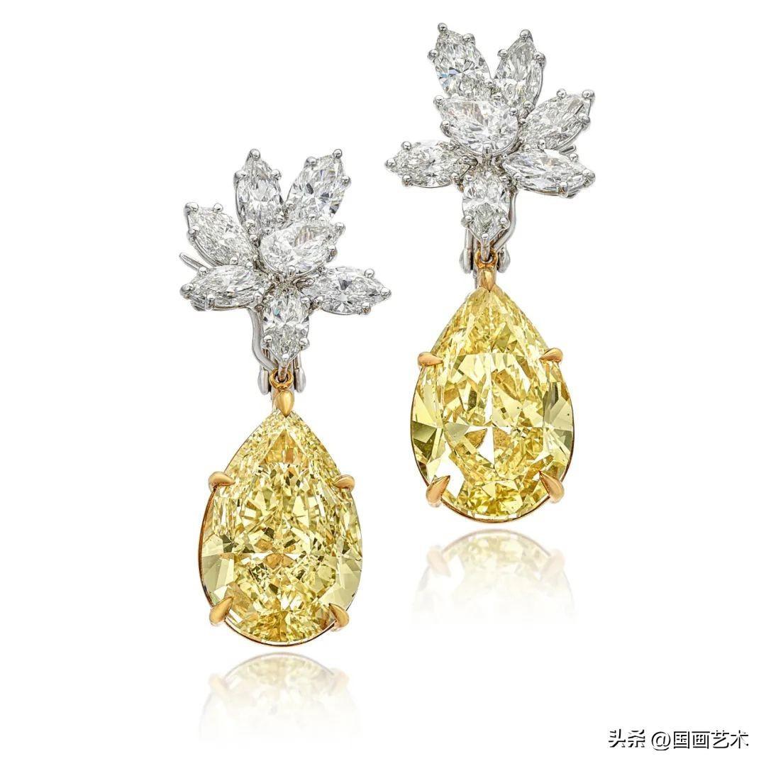 每件分別懸掛着一顆重達13.79克拉和13.52克拉的梨形彩黃色鑽石,可從由梨形及馬眼形狀鑽石簇組成的頂部拆卸,鑲嵌於白金和18克拉黃金之上,頂部印有「HW」品牌標誌。