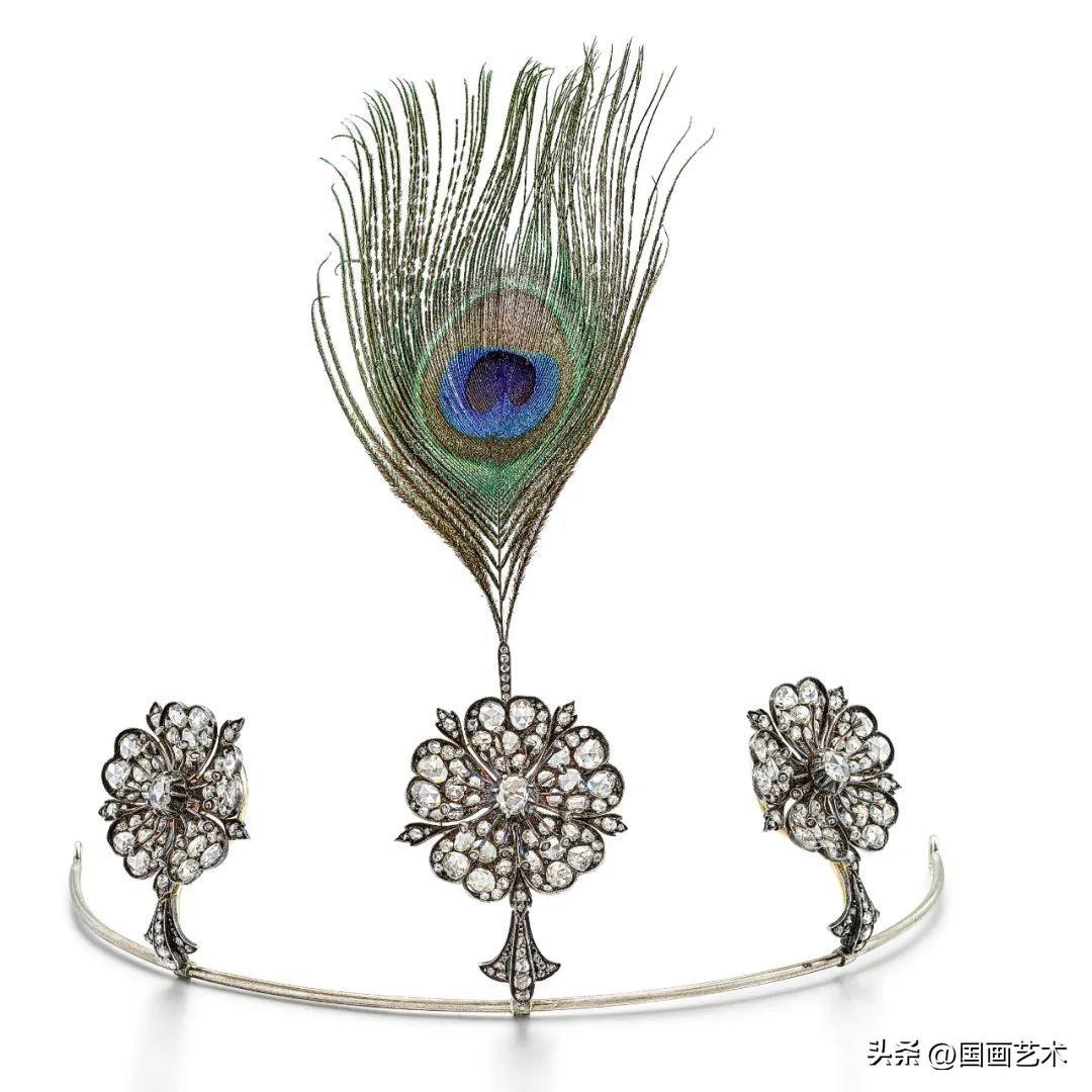 這款冠冕由三朵鑲嵌了玫瑰切割及舊式切割鑽石的花朵組成,中央部分同樣鑲有羽毛裝飾,鑲嵌於鍍銀黃金之上,花朵和羽毛支架可拆卸,盒身印有「Wartski」品牌標誌。