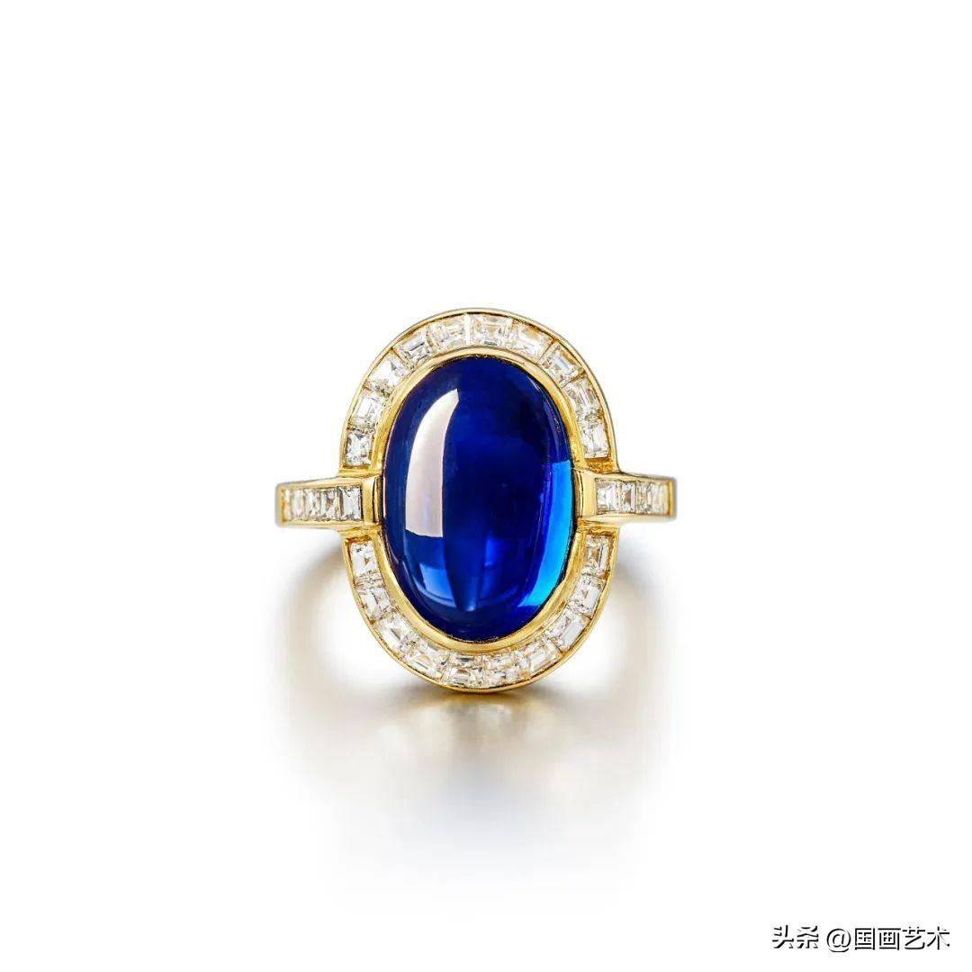 鑲有一顆約重9.30克拉的旦面藍寶石,以梯方形切割鑽石爲點綴,鑲嵌於18克拉黃色黃金之上。