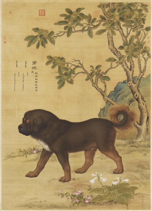 最後一隻壓軸的愛犬名爲“蒼猊犬”,由“駐臧副都統傅清”進獻。這幅畫中的獵犬與前面9只有着明顯的不同。前面的獵犬均是通體細長、肌肉遒勁,有研究者認爲它們屬於“中國細犬”的品種。而這隻蒼猊犬則是一隻藏獒,它更加渾圓的身材使其和其他獵犬區別開來。