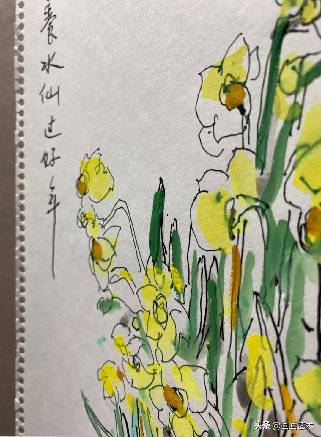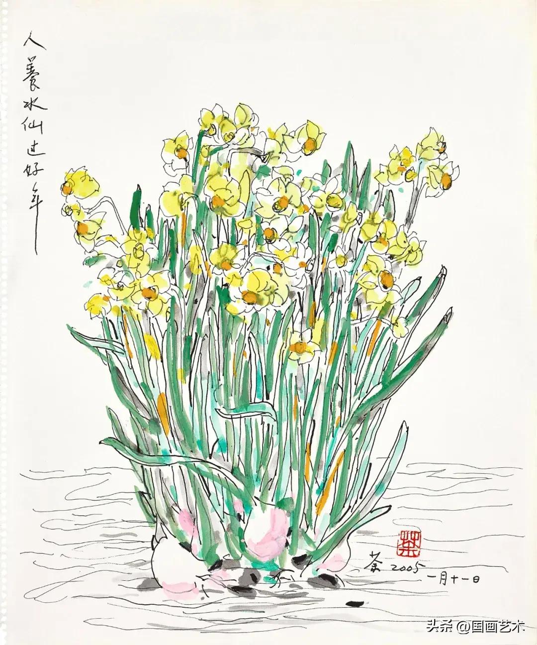 本幅寫於二○○五年一月十一日,即農曆正月初二,畫家乘歲始寫盛綻水仙,似招一室沁人清香,得春到人家吉意。