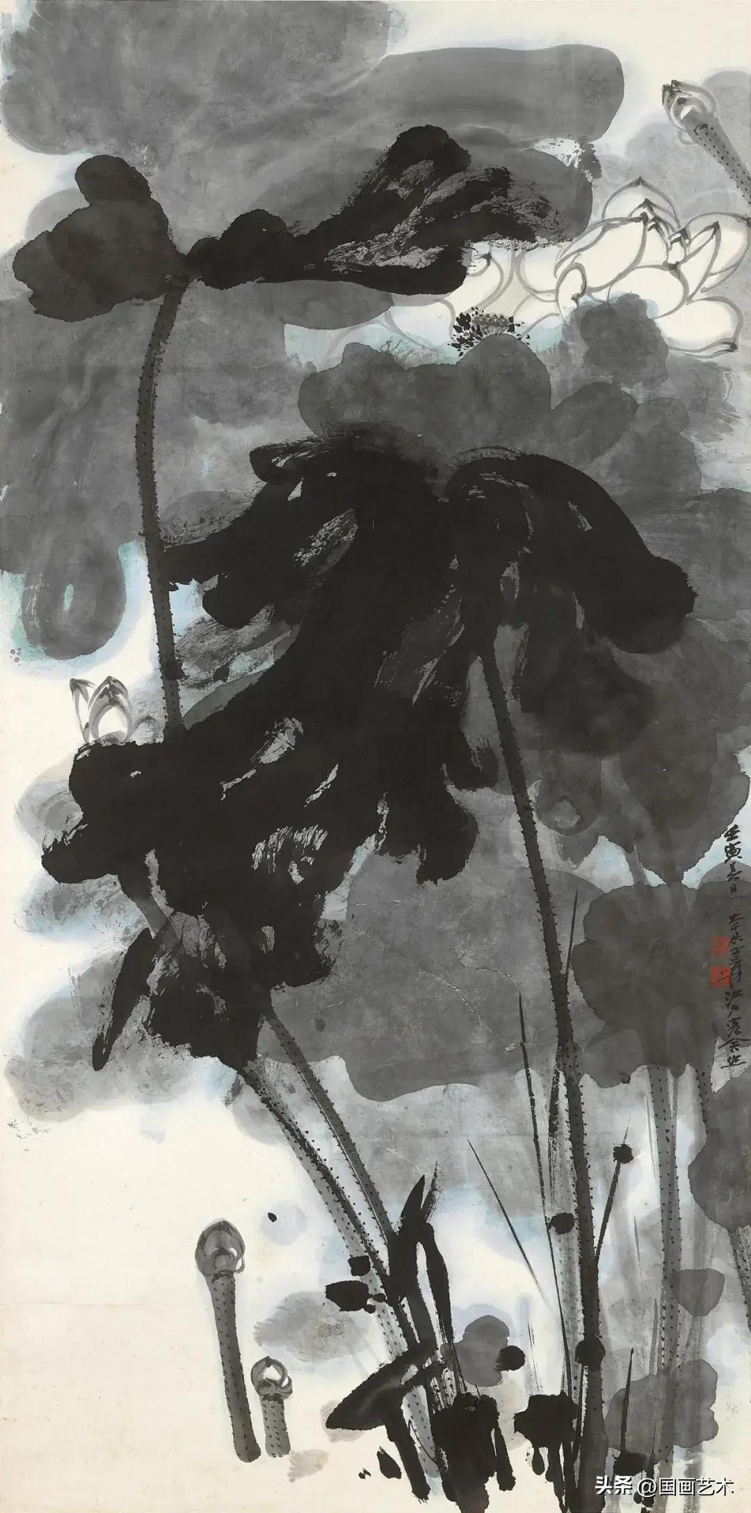 題識顯示,本幅乃此間所寫,彼時畫家正爲目疾所擾,細筆不復作,遂別闢天地,轉向寫意減筆,潑墨隨之肇始。不少尺幅巨大,筆勢恣放豪邁,氣勢懾人之作皆成於此階段,本幅即一例。