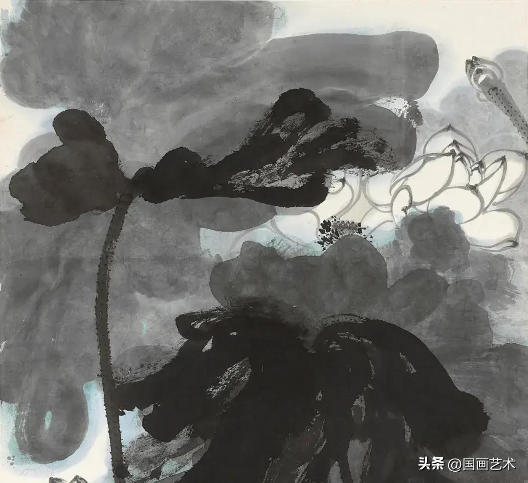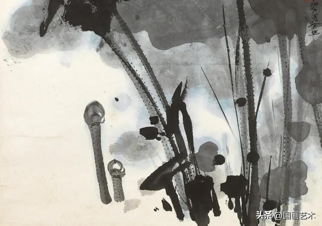 畫面表現雨霽後,池塘中荷花搖曳盪漾之姿,尤着眼於「溼」意呈現。淡墨和花青寫成大塊面的荷葉作背景籠罩畫面,前置兩幅荷葉,巨如擎蓋,以濃墨出之。三盞盛放或半開的白蓮在荷葉掩映中,各展其態。全畫動感強烈,花葉飄揚起舞,惟下方及右上三小荷苞,粗茁有勁,在留白處起了均衡畫面作用。畫家寫來筆墨酣暢,縱橫恣放,色墨中飽含水分,格外突出水氣瀰漫的氛圍,切合〈池塘過雨〉之題旨。