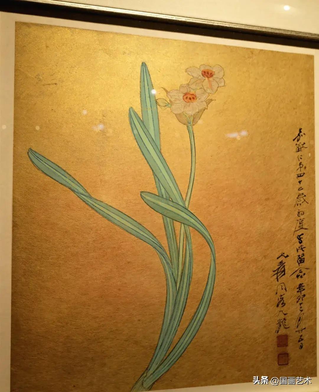 本幅署日期「辛卯十二月二十五日」,即公曆一九五二年一月二十一日,寫水仙與下幅〈牡丹〉二幀贈劉氏伉儷,爲劉氏祝壽,並寄予賀新歲之意,水仙、牡丹喻「富貴神仙」,一清雅、一豔麗;分取金箋、素楮爲材,足見下筆前考慮之周到。