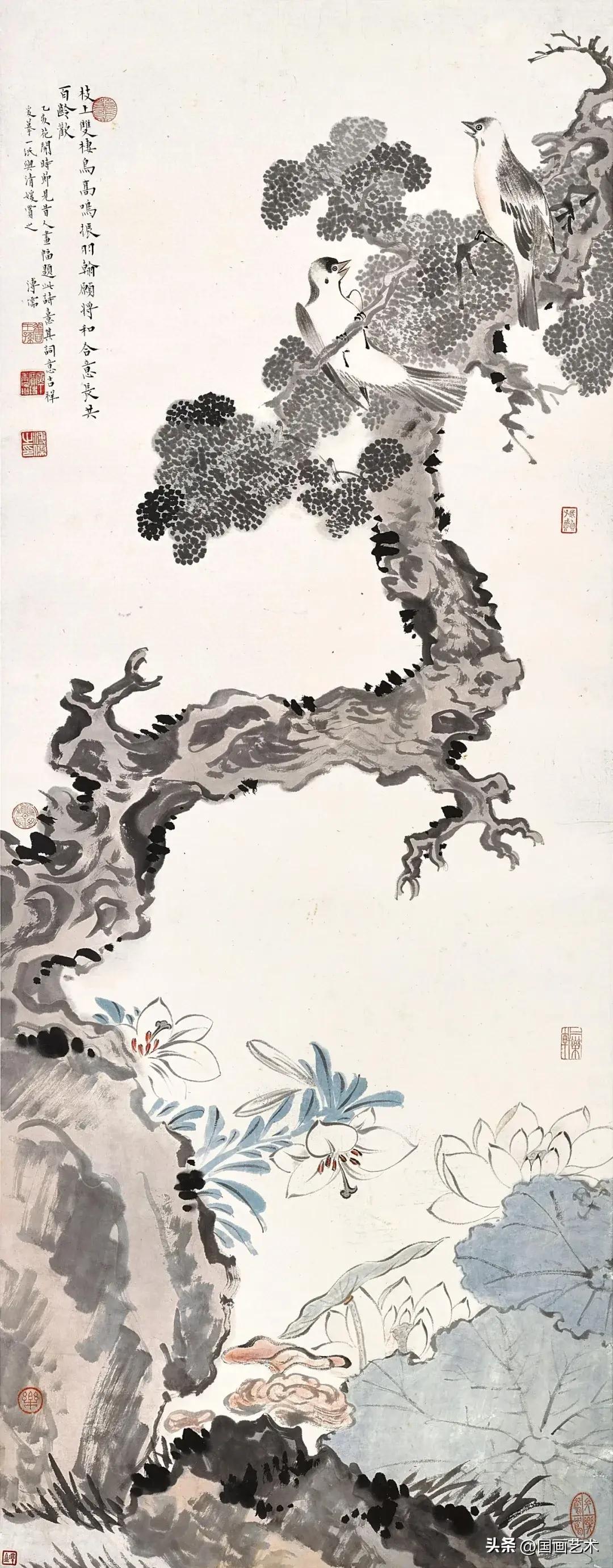 本幅乃一九三五年,溥儒見舊畫本,喜其吉意,爲羅清媛摹寫賞玩。構圖別緻,柏樹、靈芝、荷花、百合花、百靈鳥集於一紙,諧音和合百齡,寓夫妻和睦,白頭偕老。上方主要出水墨,下方花卉淡施色彩,清雅出塵,筆墨細緻,極見用心。