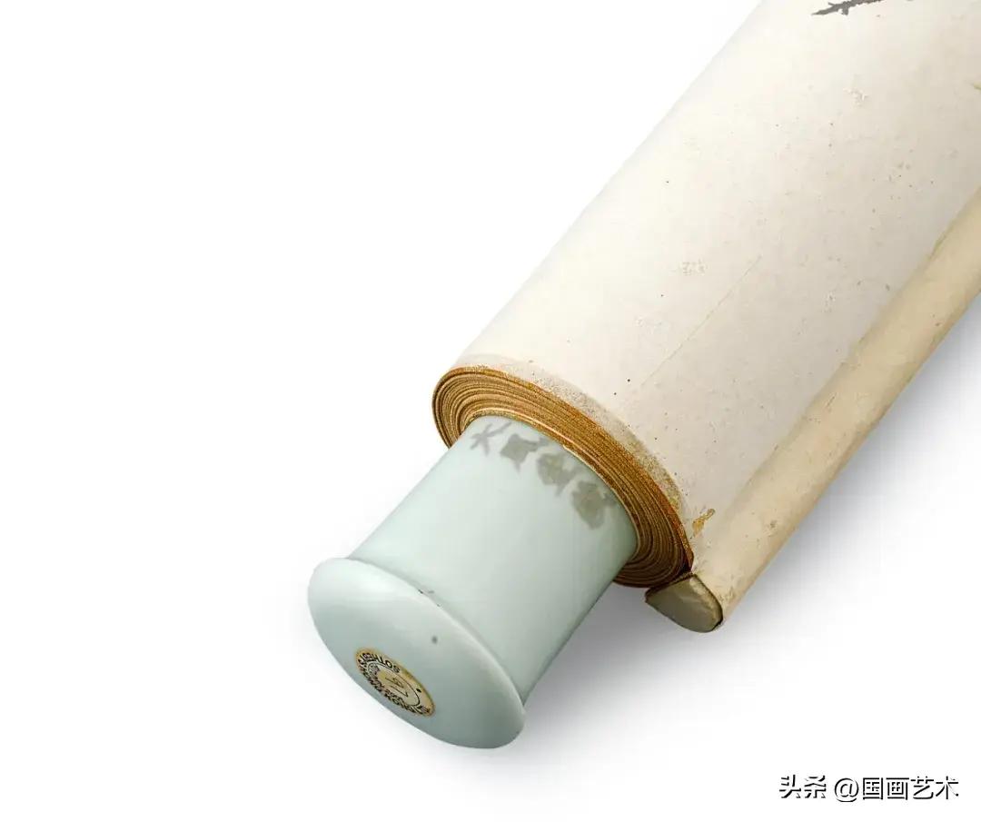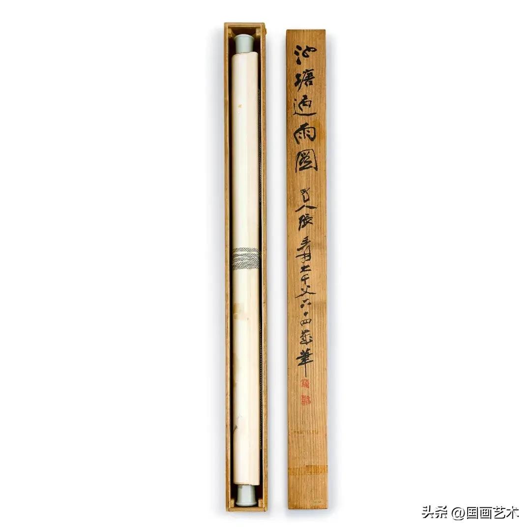 本幅裝裱極講究,應在日本付裝池,鑲有青瓷軸首,上燒「大風堂藏」字樣,乃在日本特別燒製,用於畫家鍾愛之作;並附桐木畫盒,並具畫家題署鈐印,屬「大風堂」珍藏之物。