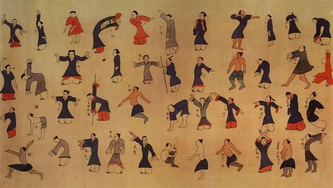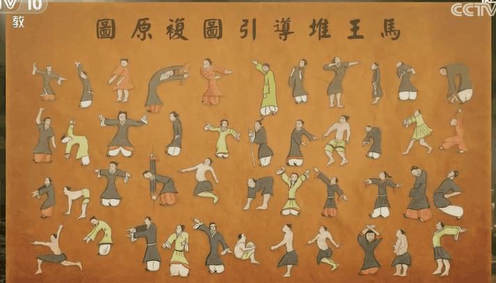 春秋戰國時期,這套全民健身操已非常普及。到了漢代,導引療法又進一步發展。這幅《導引圖》是現存最早的保健運動的工筆彩色帛畫,圖上繪有男、女、老、少40多人,展現了屈伸俯仰,行臥倚立各種運動姿勢。