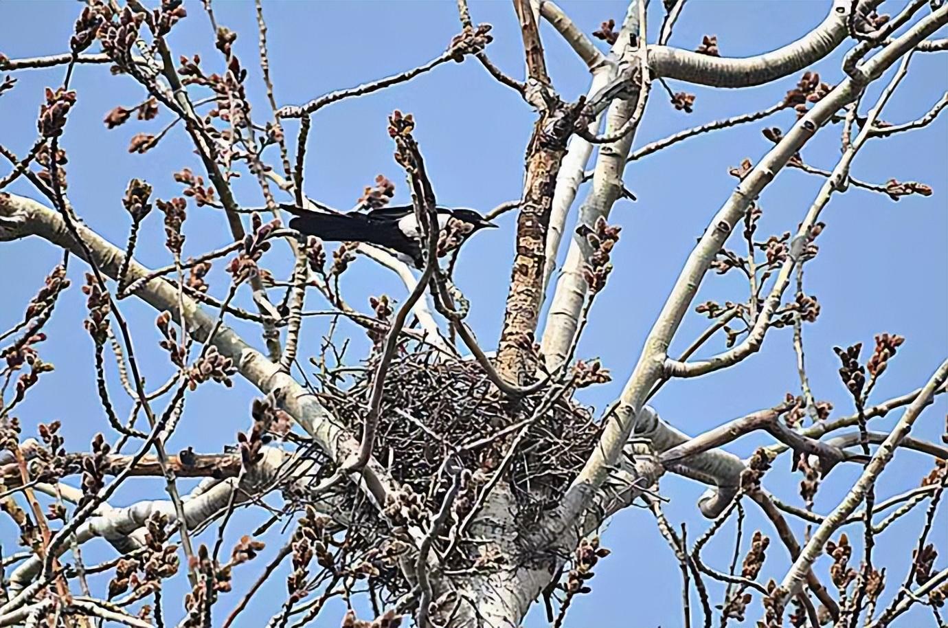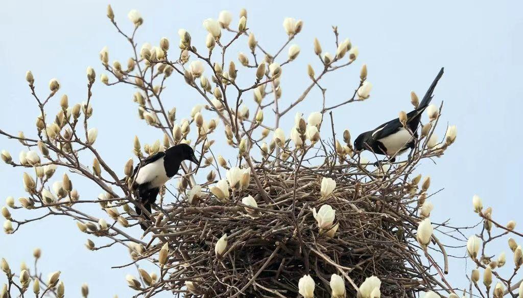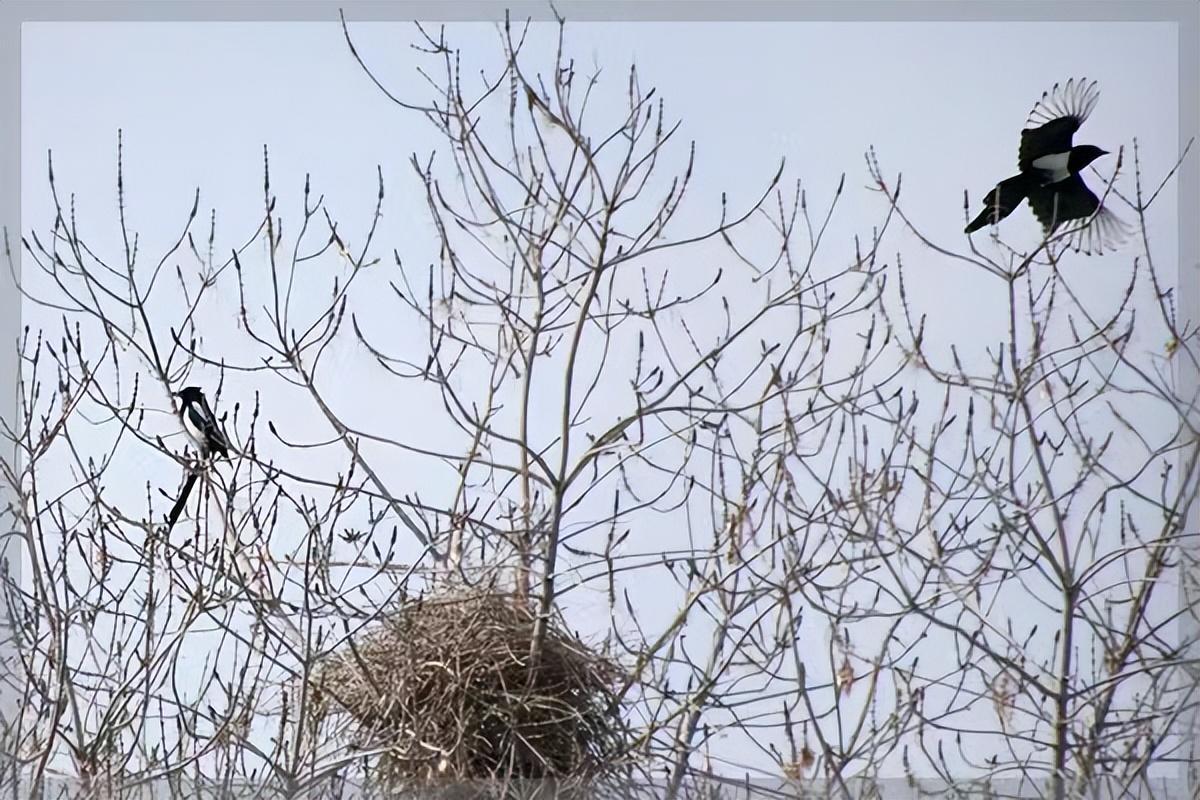 春風盪漾楊柳綠,喜鵲築巢添雛喜。