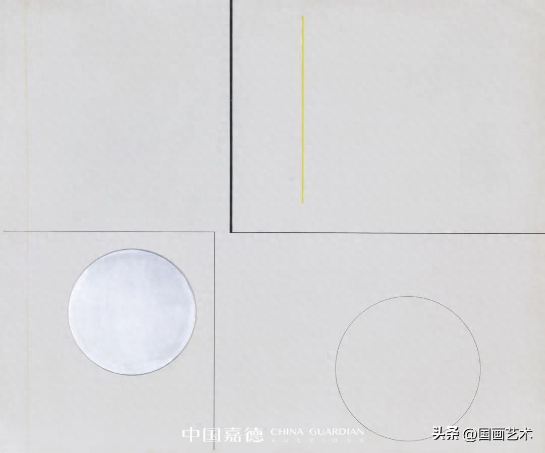 本季所呈現的《有鋁板的繪畫浮雕》完成於1960年,林壽宇通過化繁爲簡的創作形式,以常見的矩形切割,將作品分爲大小不一的四份。其中,左下的圓形運用工業時代的代表性產物──具有金屬光澤的鋁板,形成正面視角難以察覺的凸起,鋁板在當時是先進生產力的象徵,是科學技術不斷進步的產物,該材質光滑時表面銀白而發亮,粗糙時則呈暗灰色。林壽宇將這種材料用於創作,探索媒介對繪畫的影響,並使繪畫突破二維的空間,浮雕出猶如滿月一般的光暈。與之相呼應,右下更低處僅以線條所勾勒出的圓,表達了虛實相間、陰陽共生的對照關係。而畫面中較長的黑色直線與右邊略短的黃色直線,則串連起整件作品的視覺節奏,成爲其藝術創作中獨一無二的印記。