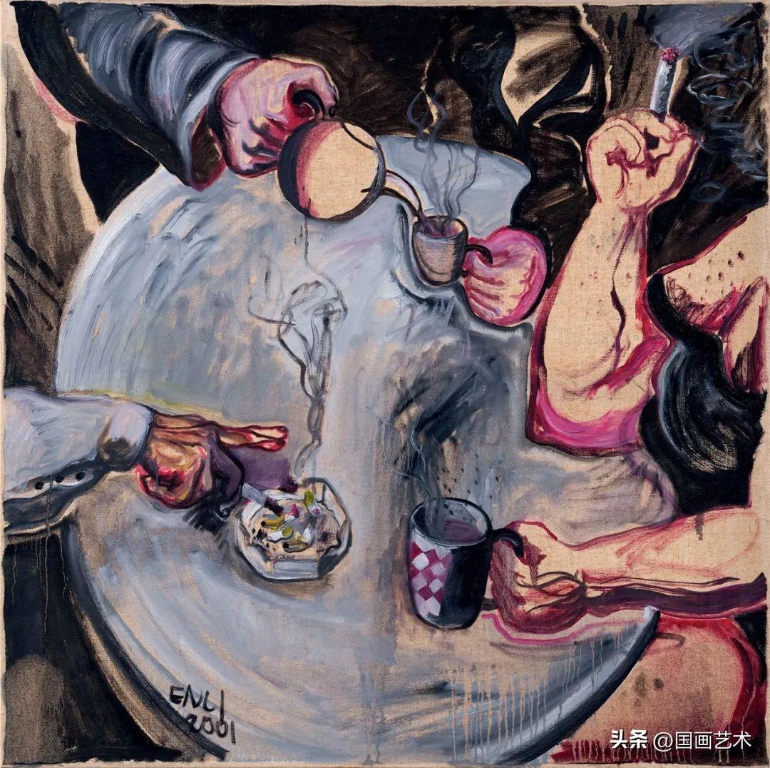 《一筆生意》兩聯都發生在一個白色圓桌上,同樣的俯瞰視角,卻演繹出截然不同的故事,暗示生意談判的兩個階段。左聯中,三個人圍繞圓桌呈三角形的穩定構圖,兩個魁梧豐腴的肉體以實在的分量感充滿了畫面右側空間,左側之人僅一隻手入畫,襯衫袖子暗示了“精英”身份,他輕快地彈掉菸灰,三人抽菸、喝茶,煙霧和熱氣嫋嫋升起,而又互不侵犯,大家謹守着邊界感,生意在理性氛圍下展開。